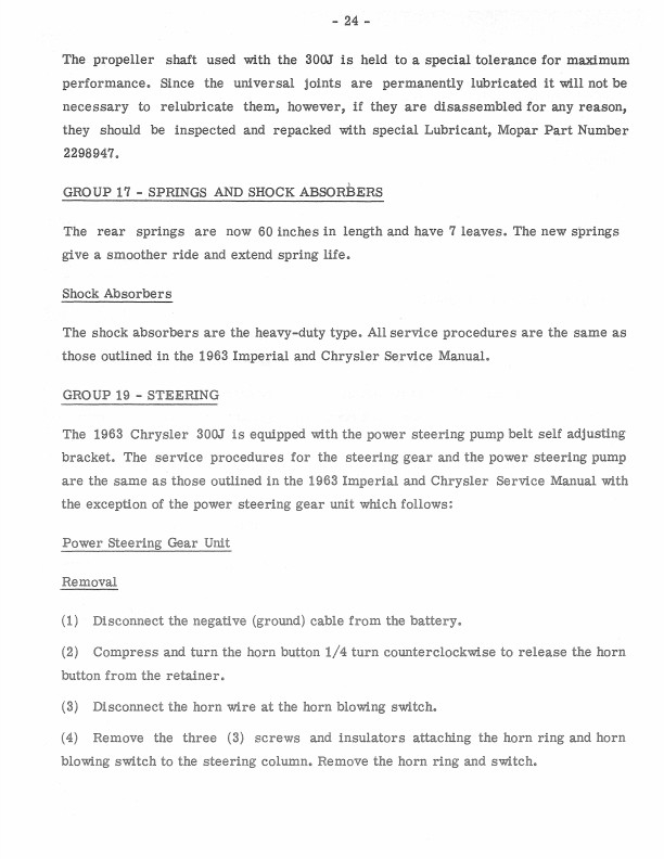 This is a page-for-page reproduction of the manual that Chrysler mechanics used to service your car. It shows you how to repair 300J-specific parts, such as carburetors, engine, intake manifod, springs, and more. This supplement shows you those features of the letter car that differ from the standard Chrysler. For repairs that are the same, this book will refer you to the 1963 Chrysler manual. With step-by-step instructions, clear pictures, and specifications, you will have the information you need to get your project on the road and keep it there. This book covers 1963 Chrysler 300J models only. It measures 8.5" x 11", has 39 pages, and is in new condition. Buy now to own the best manual for your car.
