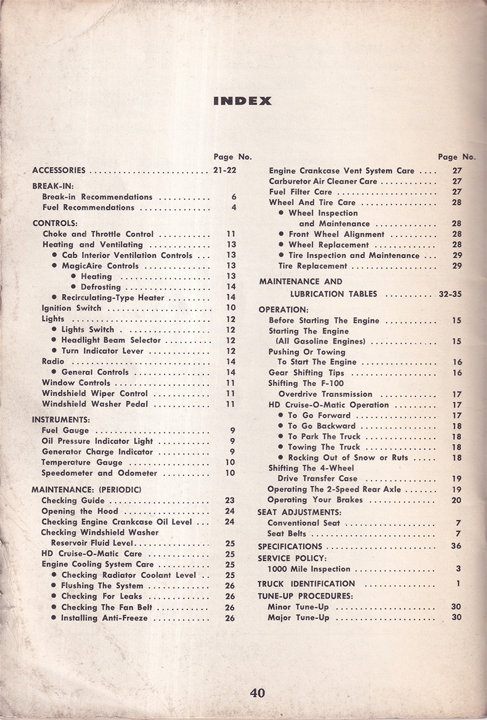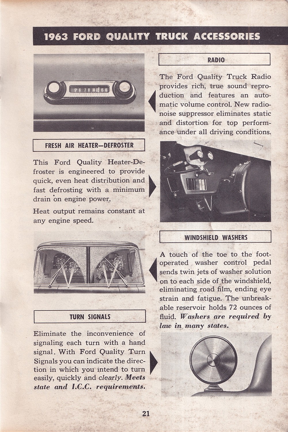 This is the manual that was issued with 1963 Ford trucks. You will find instructions for operation of the instruments & controls, accessories, choke & throttle control, heating, ventilation, MagicAire, ignition switch, radio, window controls, Cruise-O-Matic, cooling system, crankcase vent system care, seat adjustment, carburetor, and fuel filter. Also includes specification charts for wheel nut torque, front wheel alignment, engines, tubeless tires, rear axle lubricant capacities, fuel tank capacities, transmission refill capacities, engine crankcase refill capacities, engine cooling system refill capacities, and load capacities. The book has 40 pages of illustrations and step-by-step procedures. Buy now for the best manual for your Ford.