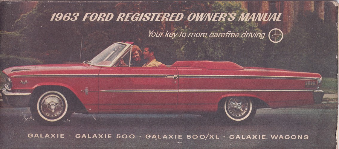 This is an original manual that was issued with 1963 Ford Galaxies. You will find step-by-step instructions for operation and service of controls and instruments such as the air-flow damper controls, battery, brakes, choke, convertible top, cooling system, locks, Fordomatic, fuses, heater, ignition switch, and a maintenance guide. The book has 64 pages of illustrations and step-by-step procedures,. This manual covers the 1963 Ford 300 and all Galaxies -- 500, XL, 2-door, 4-door, Country Squire and Country Sedan wagons, Sunliner, convertible, and even the 1963½ fastback. This is a revised edition, so it even includes the 1963.5 Super Torque car with the 427 engine. Buy now for the best manual for your Ford.
