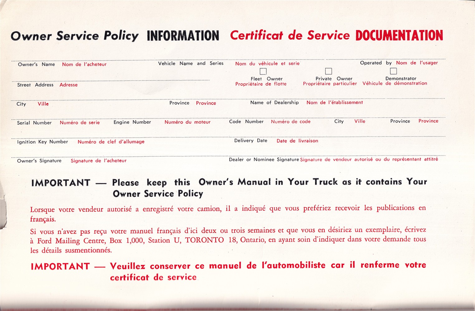 Ford and Mercury Truck Operator's Manual and Owner Service Policy Series 500 through 800