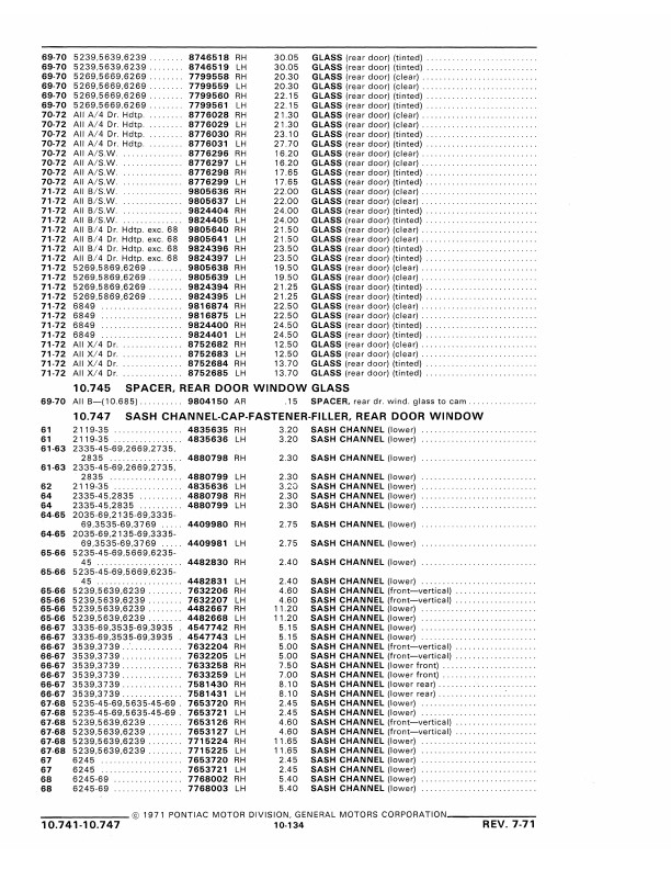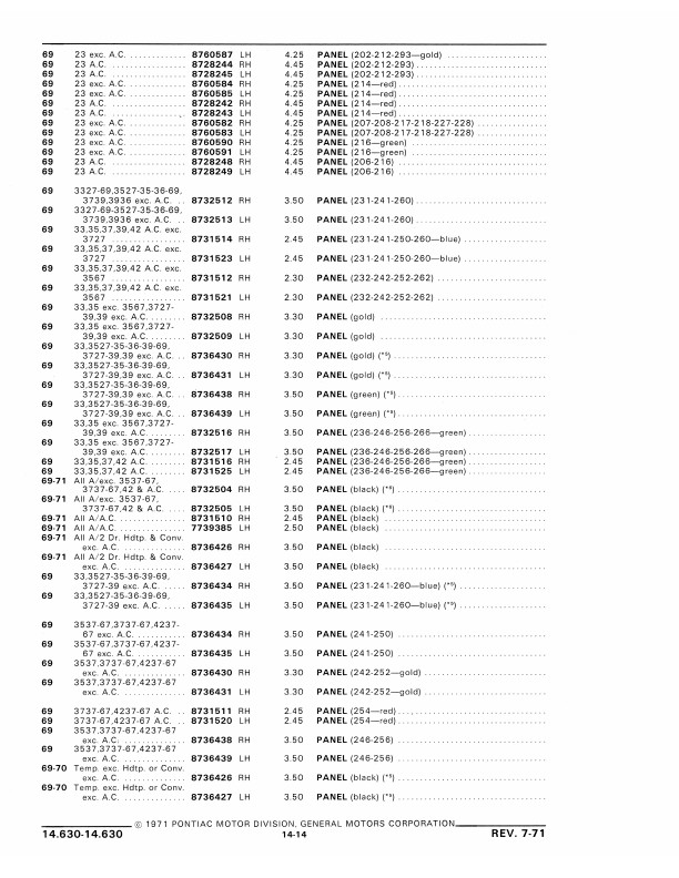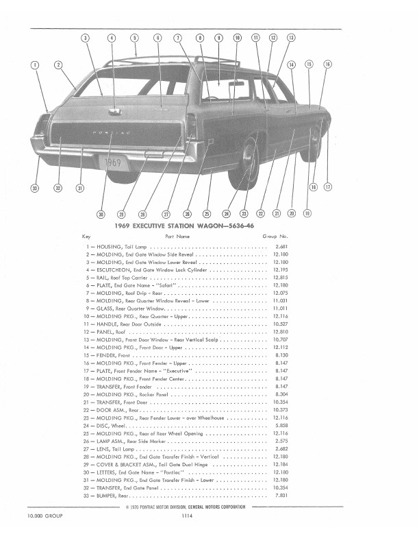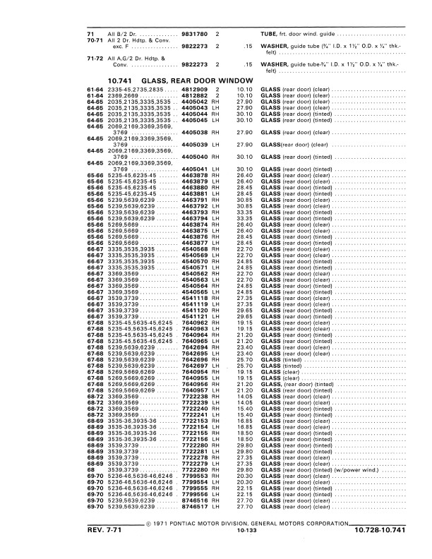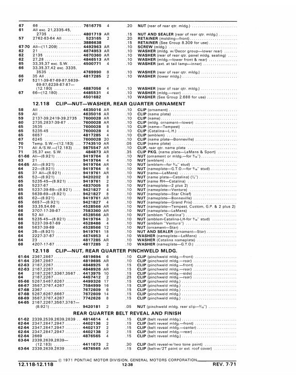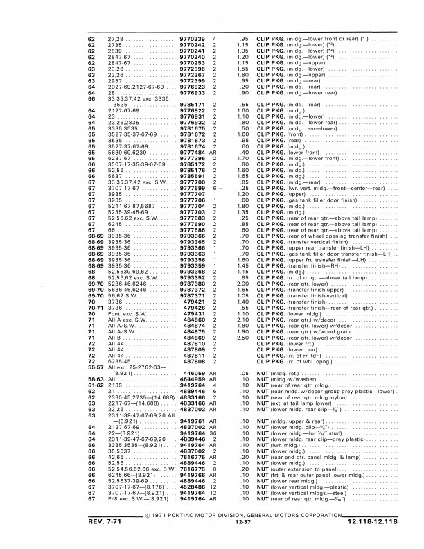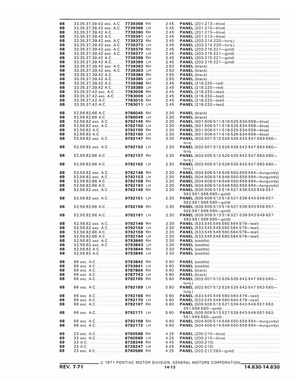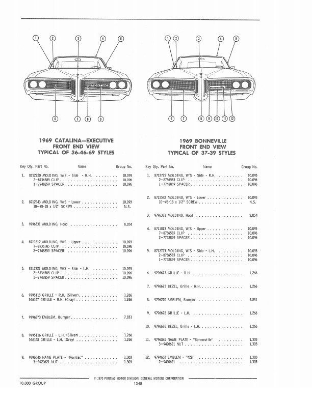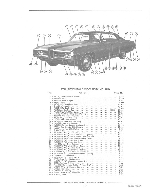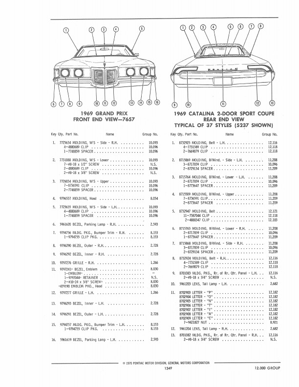 This book includes body and interior parts from the firewall back; a separate mechanical parts book covers the front fenders, grill, and dash. This is the book that dealership parts & service departments used to order parts. The illustrations in the book will help you to identify parts, and the exploded views can aid you with the assembly or disassembly of some parts of the vehicle. The text is a list of the parts available at the time of publication with data such as part numbers, model-year application and/or component application, part names, and more.