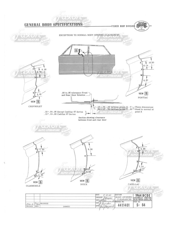 🚪 Opening Clearances: Understand the precision of door, window, and trunk openings with detailed diagrams and clearances listed by body style. Get up close with joint clearances, moldings, channels, and metal surfaces, guided by arrows pointing to specific locations.