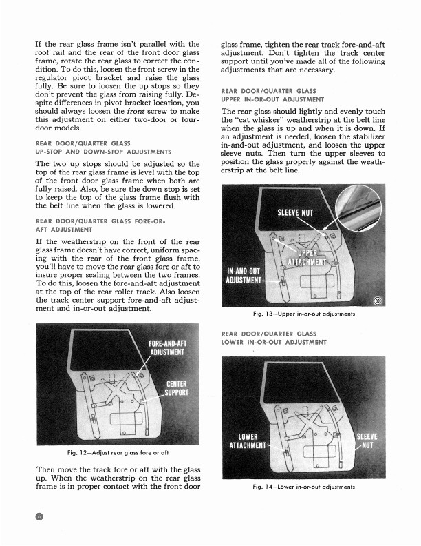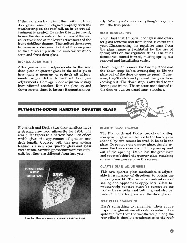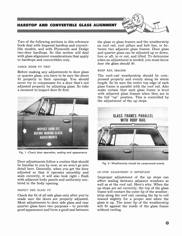 This is a reprint of the manual that was made to train Chrysler dealer mechanics to work on windows. You will find step-by-step illustrated instructions for the following glass adjustments: hardtop and convertible door glass, Imprial side glass, and Plymouth & Dodge two door hardtop rear quarter glass. You'll also learn about rear window removal and installation. This book has 14 pages and in new condition. Buy now for this hard to find manual.