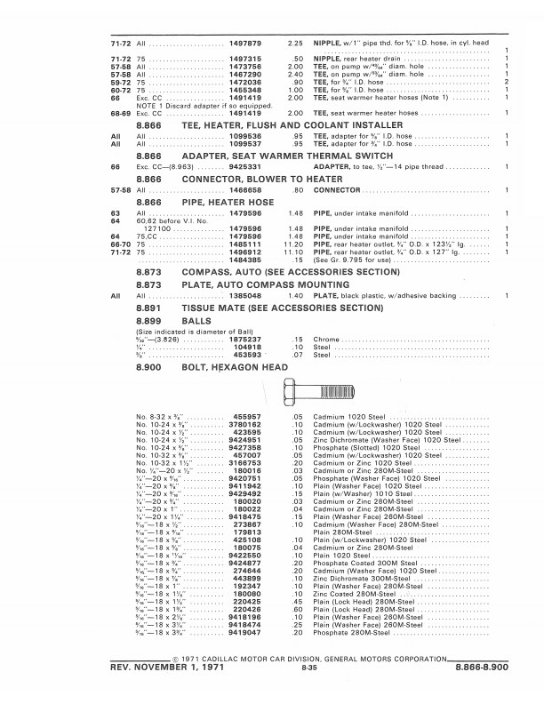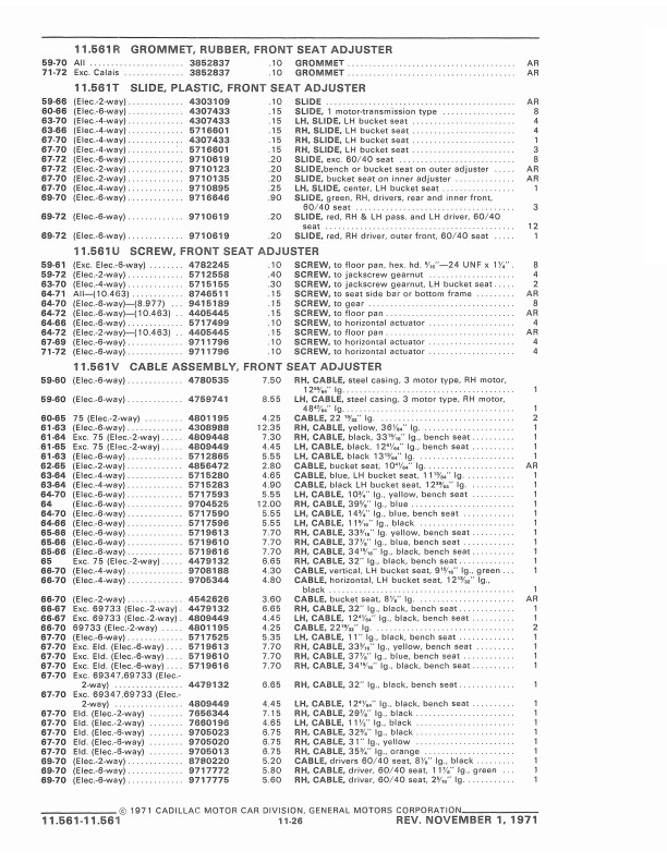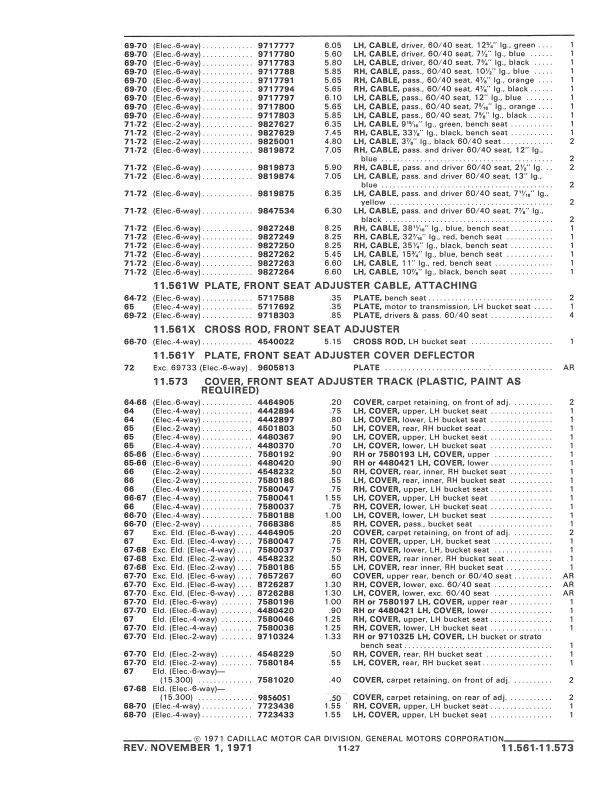 This reprinted set is your ultimate resource for original part numbers with illustrations for Cadillacs. It is a reproduction of the book your Cadillac dealer would have used to order parts back in the 1970s. You will find any part on your car. The numerical and alphabetical lists cover practically every part that could be serviced from the factory. You will also find exploded view illustrations, exterior/interior color combinations, trim packages, group & part numbers, most of the standard hardware (nuts and bolts), the quantity per car, and each part's applicable year. You can use this book to help you find parts today because most parts dealers still use Cadillac's original part numbers to keep track of their parts. You can also identify if the parts you are buying are original and complete; if you're missing parts, you can use the book to see what you should have. If the same part number is used for more than one year, you can also find out interchange between the different years and models covered in the book. New condition. Buy now to own this useful manual.