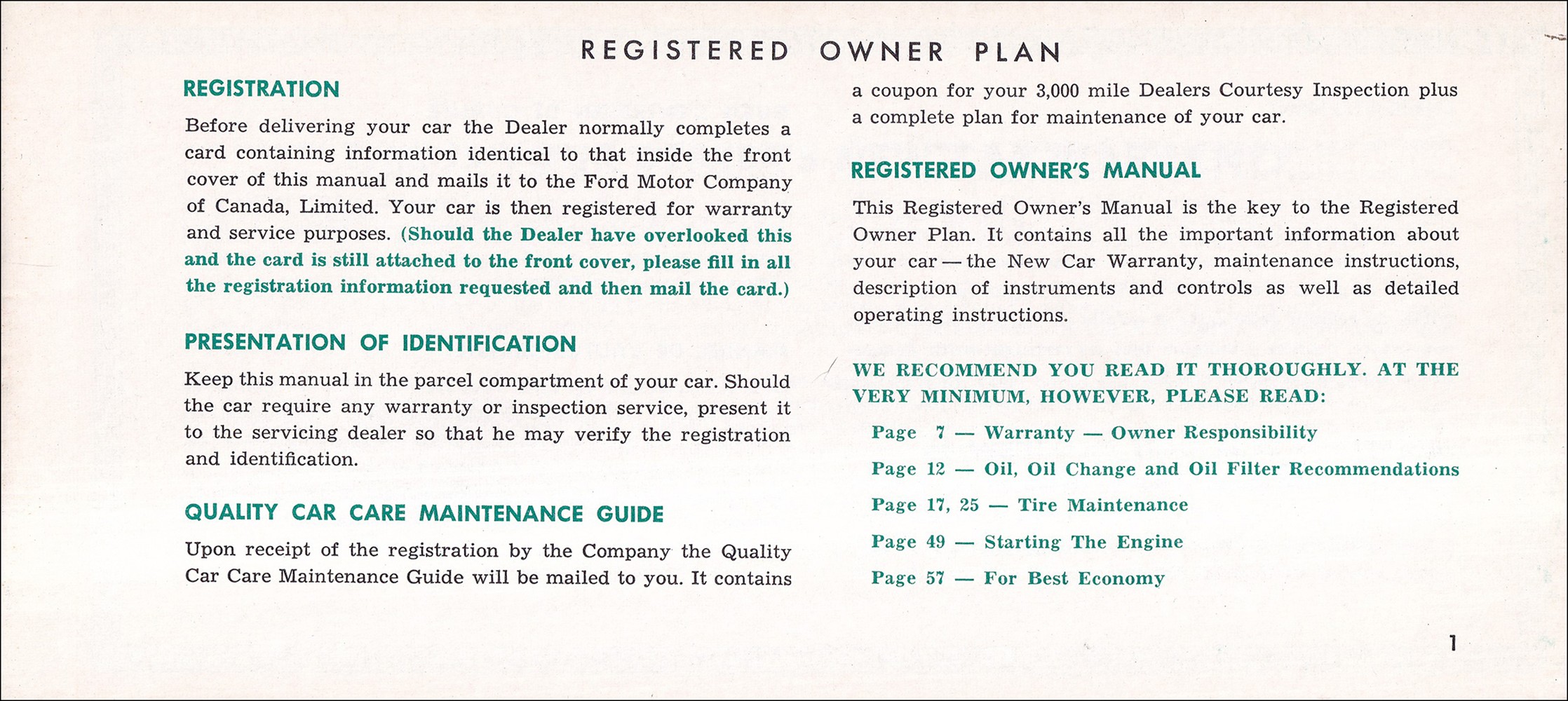 This is an original owner's manual that would have come with your 1965 Ford in Canada. You will find instructions on starting & operating, safety, towing, cold weather operation, and maintenance. You will also find specifications, tables for scheduled factory maintenance, instrument panel & controls, and details on accessories. Buy now to own the best manual for your car.