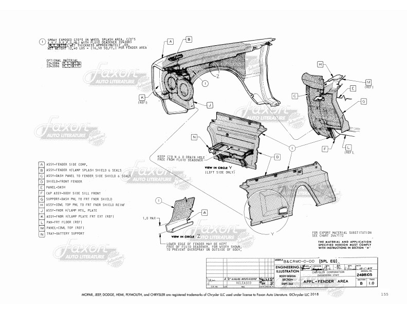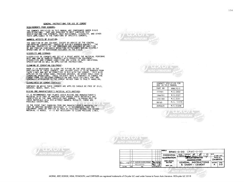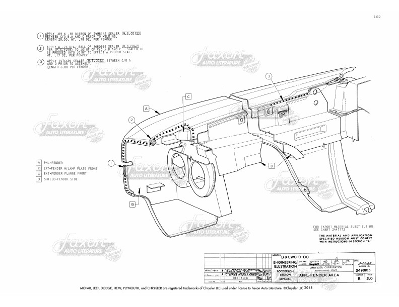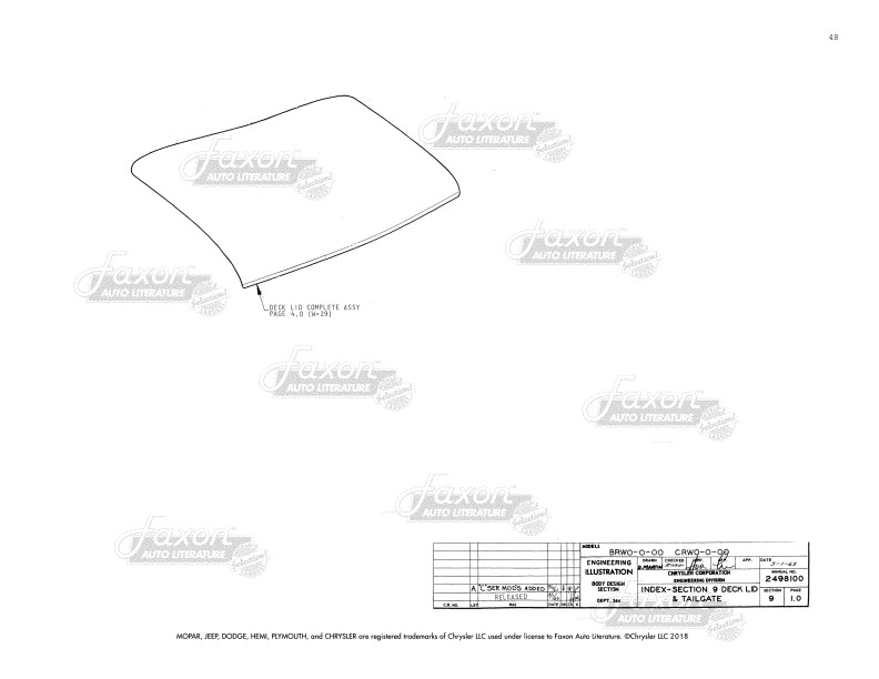 - Paint: Illustrates areas that are to be painted with each type of paint, including inside the engine compartment. It defines which areas are to be painted with interior vs. exterior colors. You’ll also see diagrams for the application of stripes with measurements for placement.