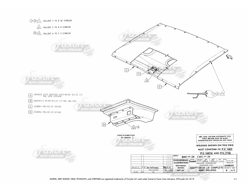 - Plugs, Gaskets, and Rubber Parts: You get part numbers for rubber parts to install body parts. See illustrations of exact locations and instructions for applying rubber parts and gaskets to hood, antenna, dash, underbody plugs, quarter panel, and trunk.