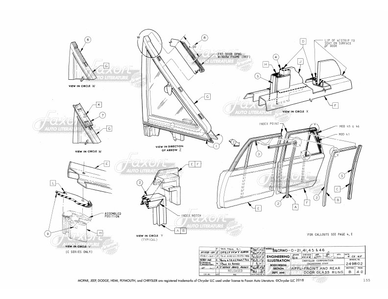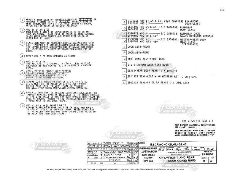 - Plugs, Gaskets, and Rubber Parts: You get part numbers for rubber parts to install body parts. See illustrations of exact locations and instructions for applying rubber parts and gaskets to hood, antenna, dash, underbody plugs, quarter panel, trunk, a d convertible top well and header.