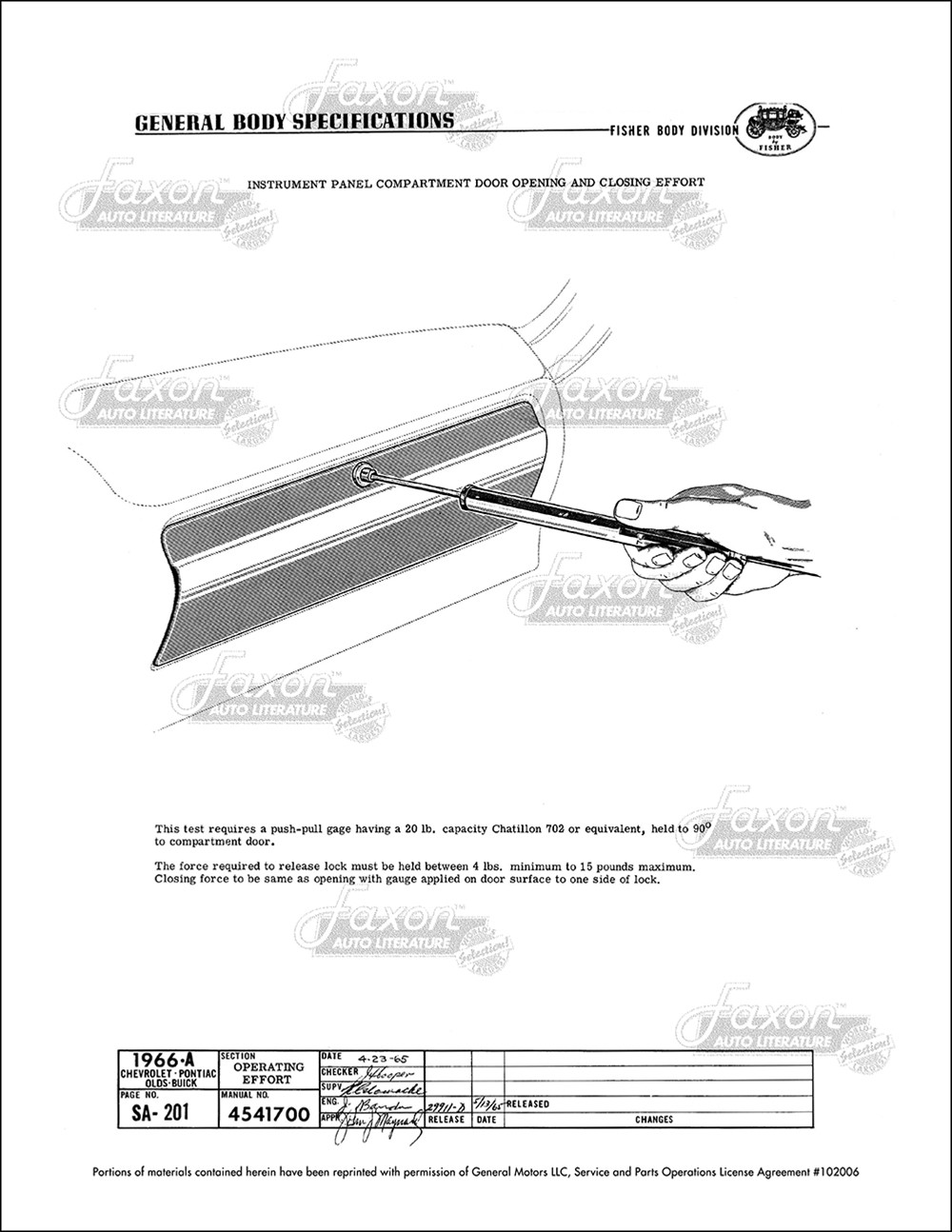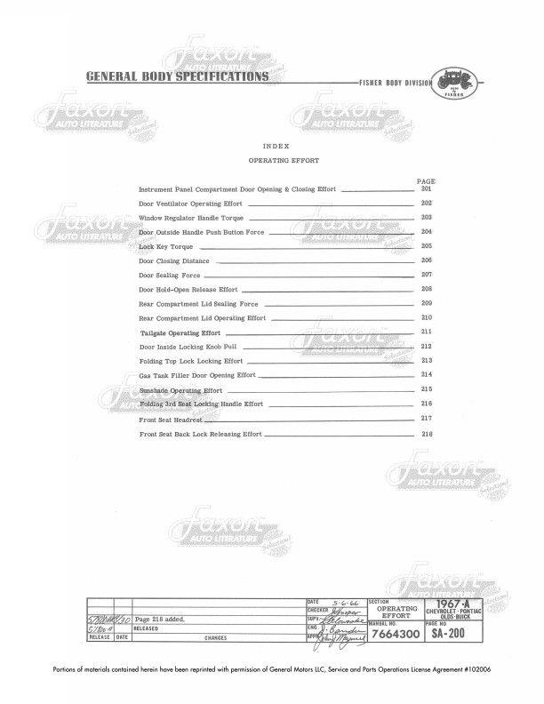 This assembly manual was written by GM engineers for use in the Fisher Body assembly plant. It gives you specifications for clearances, operating effort, leak testing, and torque.