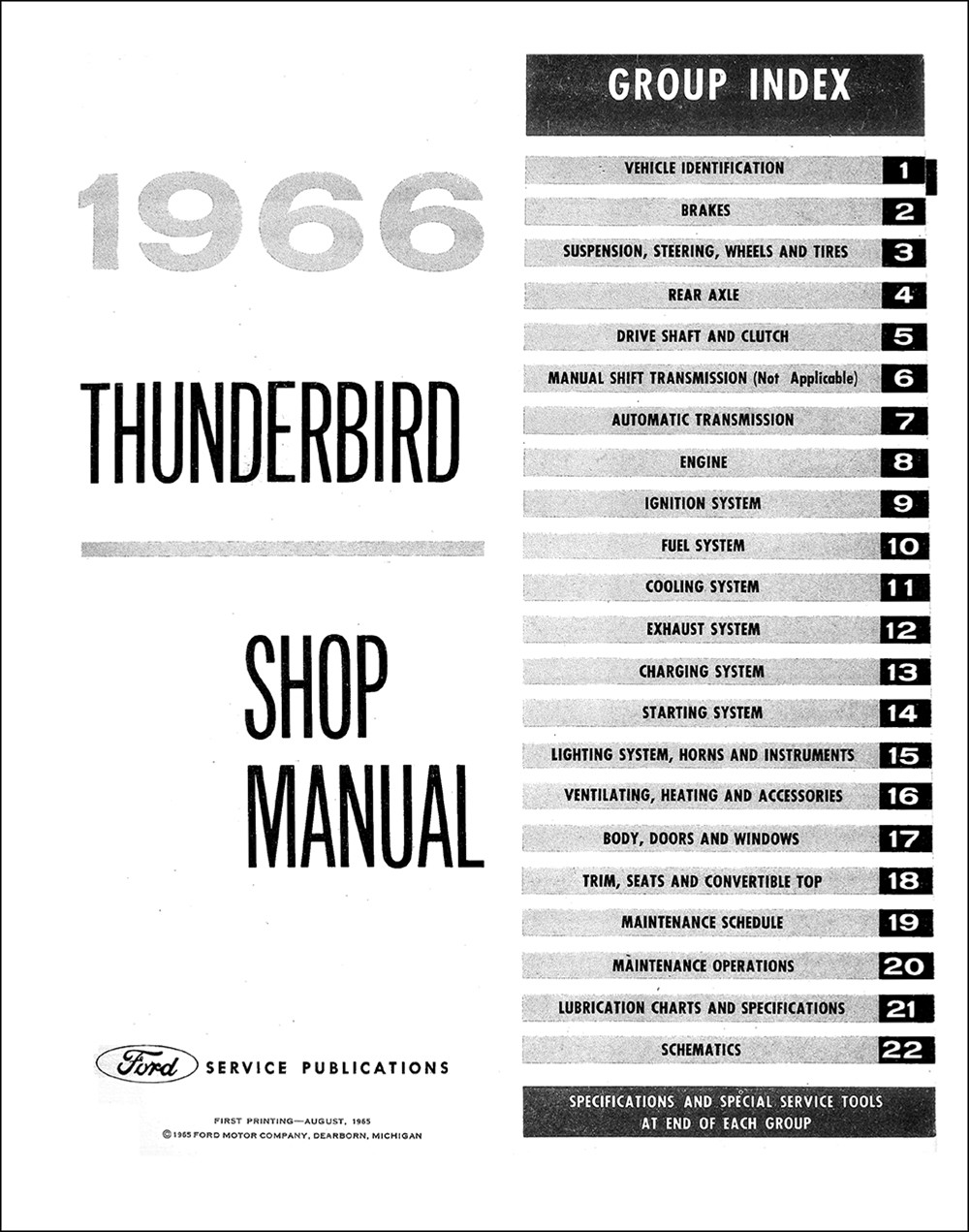 This manual, printed by Ford, is an original manual that Ford mechanics used to service vehicles. You will find detailed service procedures for engine, exhaust, ignition, fuel, and cooling systems, clutch, manual transmission, cruisomatic transmission, rear axle, driveline, wheels, tires, steering, and brakes. With the step-by-step illustrated instructions, specifications, and wiring diagrams in this manual, you will have the information you need to get your project on the road and keep it there. Buy now to own the best manual for your T-bird.