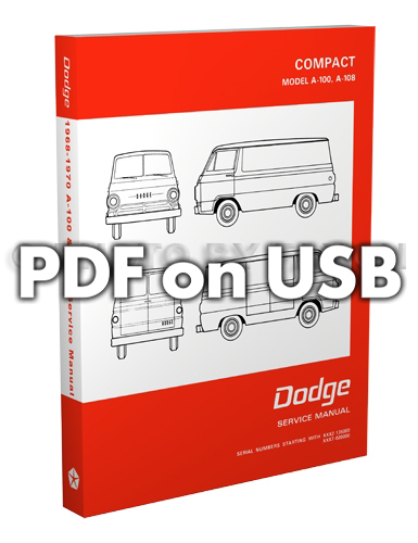 This USB offers page-for-page images of three bound manuals that Dodge mechanics used to service vehicles. It includes the 35- page "Compact Model A-100, A-108 Dodge Service Manual" for 1968-1970, as well as 1967 and 1968 Dodge truck shop manuals.