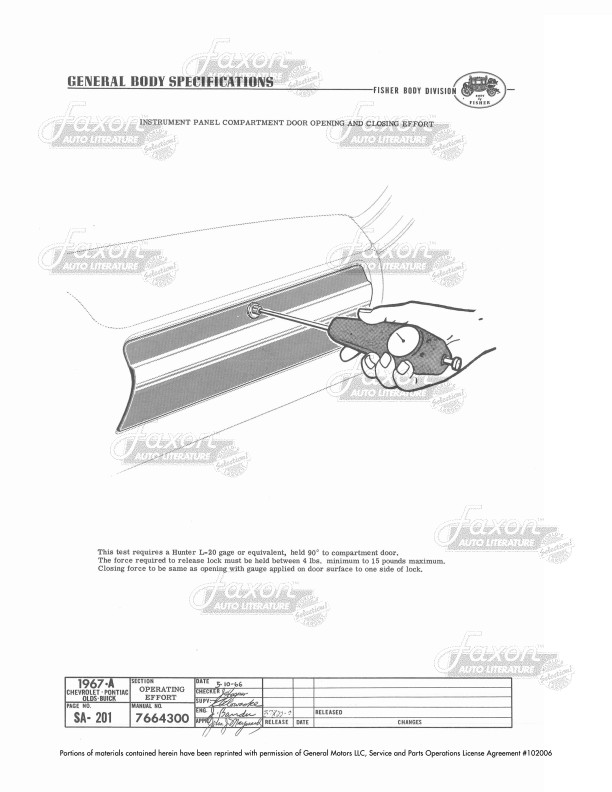 This assembly manual was written by GM engineers for use in the Fisher Body assembly plant. It gives you specifications for clearances, operating effort, leak testing, and torque.