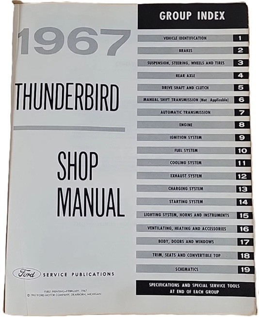 This manual contains complete service information for all 1967 Ford Thunderbirds. It is an original manual printed by Ford for use by mechanics at the dealer. You will find step-by-step illustrated repair procedures for brakes, suspension, steering, wheels, tires, rear axle, drive shaft, clutch, automatic transmission, engine, ignition system, fuel systems, cooling system, exhaust system, charging system, starting system, lighting system, horns, instruments, ventilating, heating, accessories, body doors, windows, trim, seats, and the convertible top. The book is about an inch thick. Includes wiring diagrams, specifications (at the end of each section), special tool lists, exploded view illustrations, troubleshooting diagnosis, and pictures. It covers all 1967 Thunderbirds. If you have a 1968 T-bird, you'll need this book plus the 1968 supplement. Buy now to own the best manual for your Thunderbird.