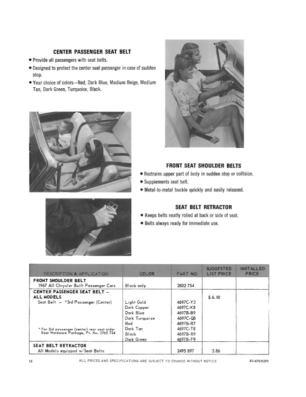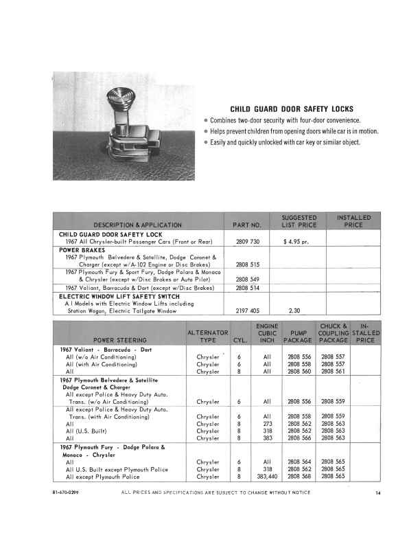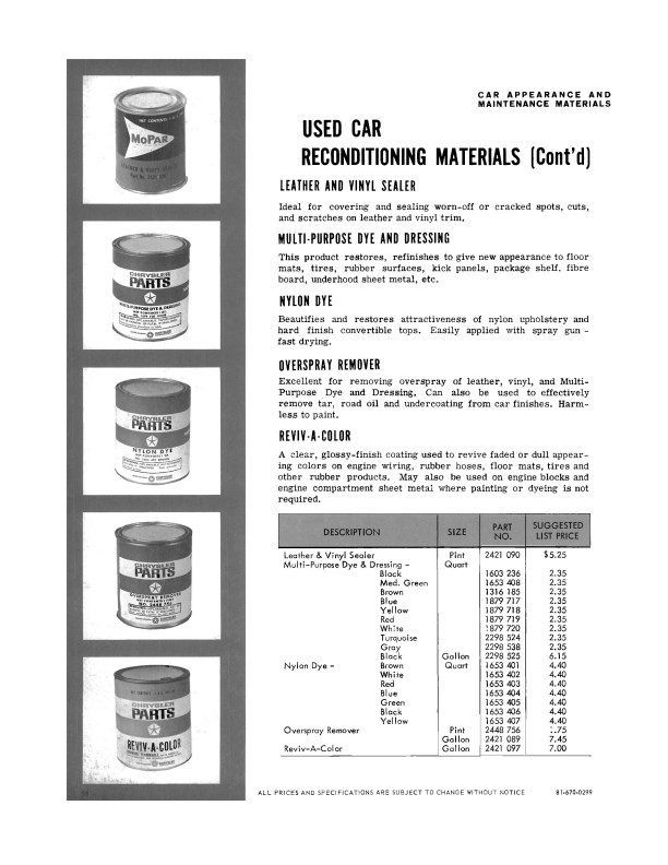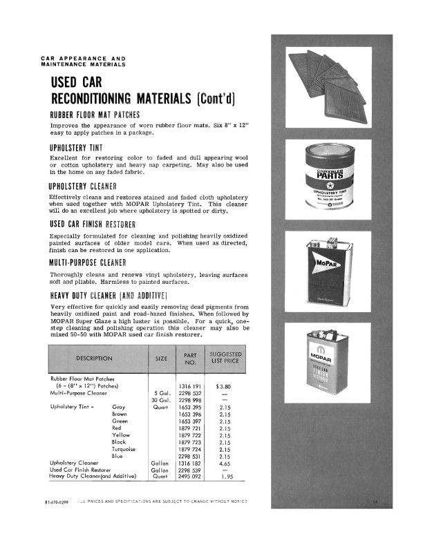 The book is a quality reprint of the illustrated accessory catalog that was used in the parts department, along with updates to that book. The first 60 pages are the parts manager's accessory catalog. You will find black and white illustrations, descriptions, and part numbers for each accessory. You'll see dozens of accessories like a/c, radios, bumper guards, clock, floor mats, lights, luggage racks, mirrors, power accessories, locks, shoulder belts, gauges, hubcaps, roof racks and much, much more. You'll also see a section on Mopar appearance and maintenance materials.
