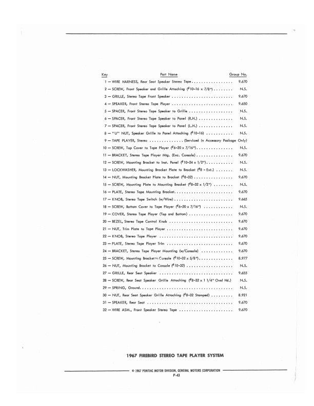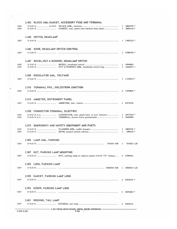 This book shows the parts for 1967 Firebird that are unique to that car and different from other Pontiacs. This is the book that dealership parts & service departments used to order parts. The illustrations in the book will help you to identify parts, and the exploded views can aid you with the assembly or disassembly of some parts of the vehicle. The text is a list of the parts available at the time of publication with data such as part numbers, model-year application and/or component application, part names, and more. An alphabetical index allows you to quickly look up parts by name. You can also use this book to help you decode and identify your car's original equipment, including the VIN (serial number), body plate, paint and trim combinations, RPO (regular production option) codes and label, as well as engine and transmission assembly codes. Brand new condition. Buy now to find out all abou the parts for your 1967 Firebird.