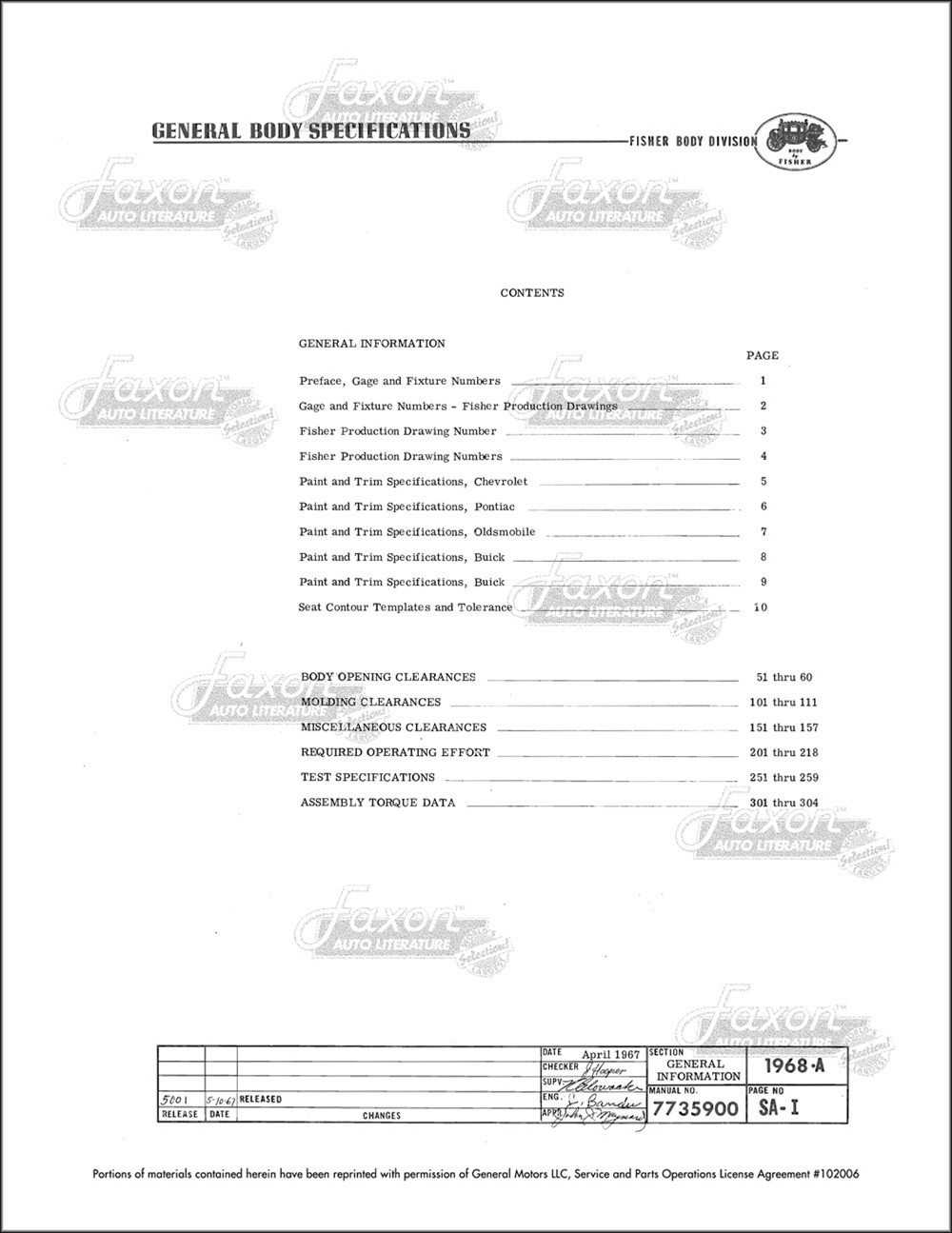 Please see the table of contents image. All pages are watermarked with a background image like the sample page. Buy now to make your car’s Fisher Body just right.