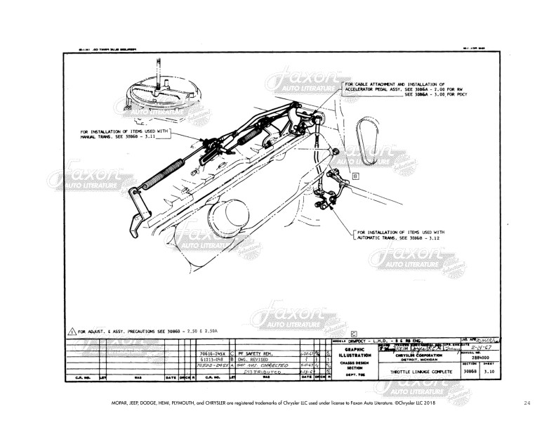 See illustrations of transmission and clutch housing, clutch pedal and linkage, steering gear and linkage, shifter and linkage, steering column, suspension, brakes, brake pedals and linkage, brake lines, exhaust system, cruise control, and bumpers.