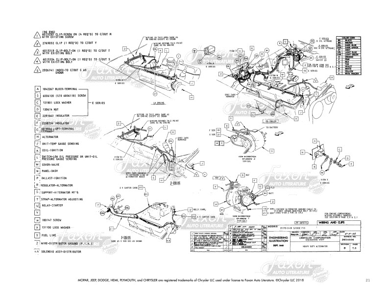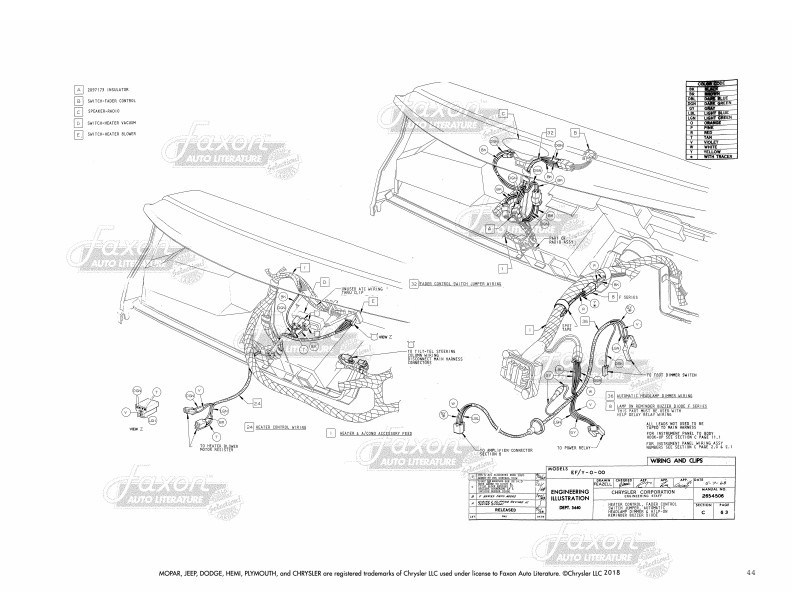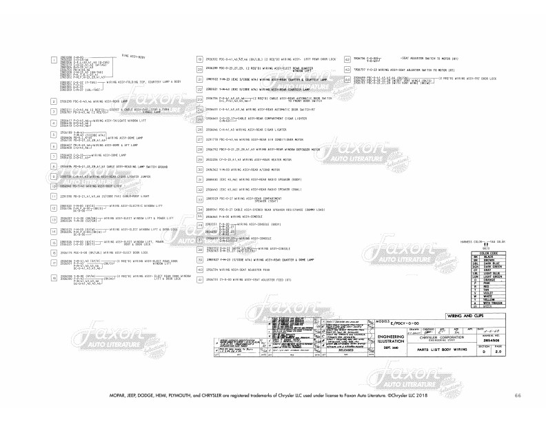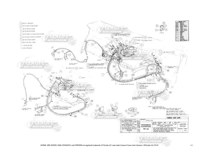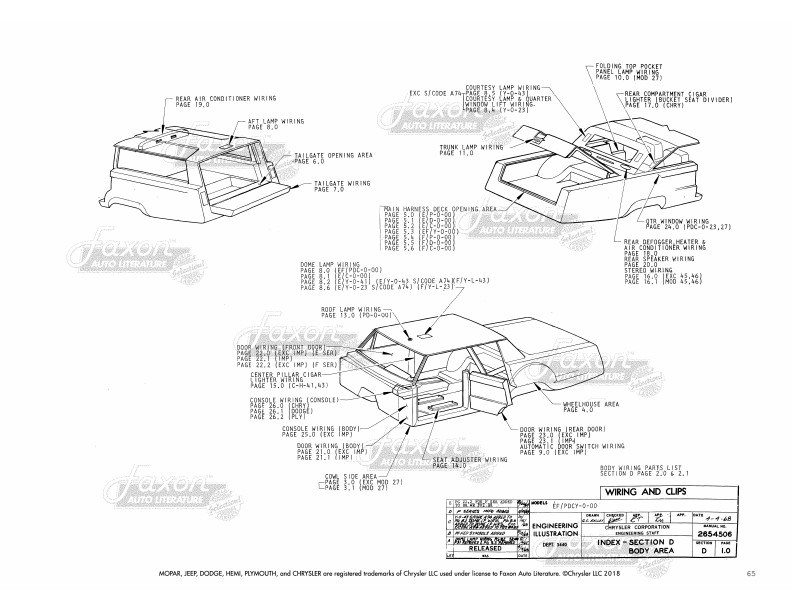 - Some of the topics covered include: engine compartment, clips for the wiring harness, harness hook ups, alternator wiring, instrument panel wiring, air conditioner wiring, trunk wiring harness and lamp, tailgate electrical, interior lamp wiring, automatic door switch wiring, folding top compartment wiring, seat adjuster wiring, stereo & speaker wiring, rear defogger & heater wiring, door wiring, quarter window wiring, and console wiring.