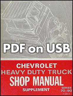 This computer USB flash drive offers page-for-page PDF images of four bound manuals that Chevrolet mechanics used to service big trucks. It includes: