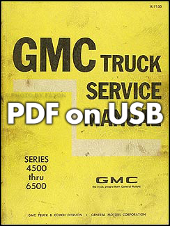 This USB offers page-for-page reproductions of ten bound manuals that GMC mechanics used to service medium and heavy-duty trucks. Get the know-how on front-end alignment, fender, hood and grille replacement, brake system maintenance, clutch removal/installation, ignition timing, engine tune-up, carburetor overhaul, power steering repair, transmission inspection, and much, much more! With clear pictures, exploded view illustrations, schematics, specifications, and a list of special tools, you will have everything you need to get the job done right. With the step-by-step illustrated instructions, and specifications on this USB, you have the information you need to get your project on the road and keep it there. Great if you have a hard copy that you want to keep clean. Buy now to own the best manuals for your vehicle on USB. We have manuals on paper also -- see our other items.
