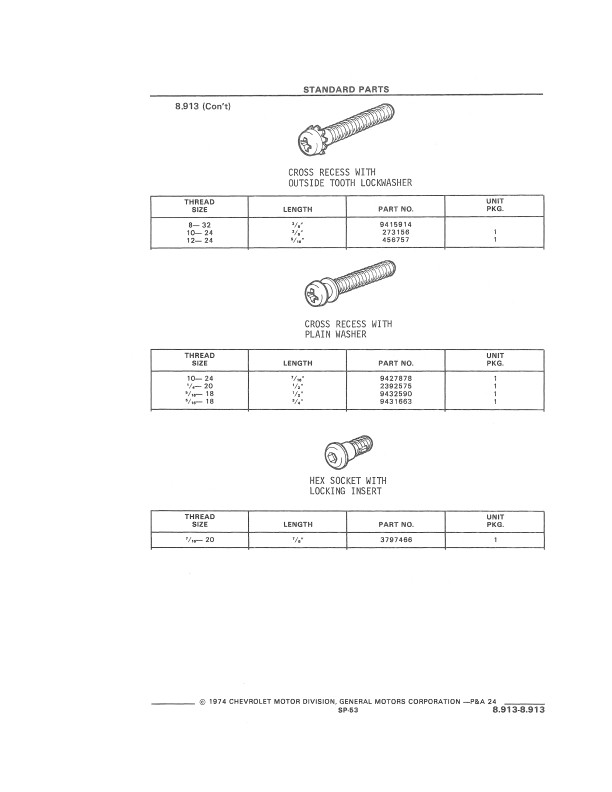 This reprint of a Chevrolet publication is your ultimate resource for finding original automotive hardware. Make your vehichle original down to the last nut & bolt. You will find standard hardware parts such as bolts, screws, springs, nuts, washers, clips, retainers, pins, drain cocks, fittings, plugs, tees, couplings, adapters, rivets, elbows, steel and aluminum balls, fuses, bulbs, and electrical connectors (terminals, and sockets). See drawings of Chevy's original parts along with original part numbers - some parts have additional details, such as length, thread size, thread style, screw size, finish, or material. If you have a parts book for your Chevy, you'll find references to hardware mostly in the 8.9XX groups. This book has those groups in it. Buy now for this hard-to-find reference from Chevrolet.