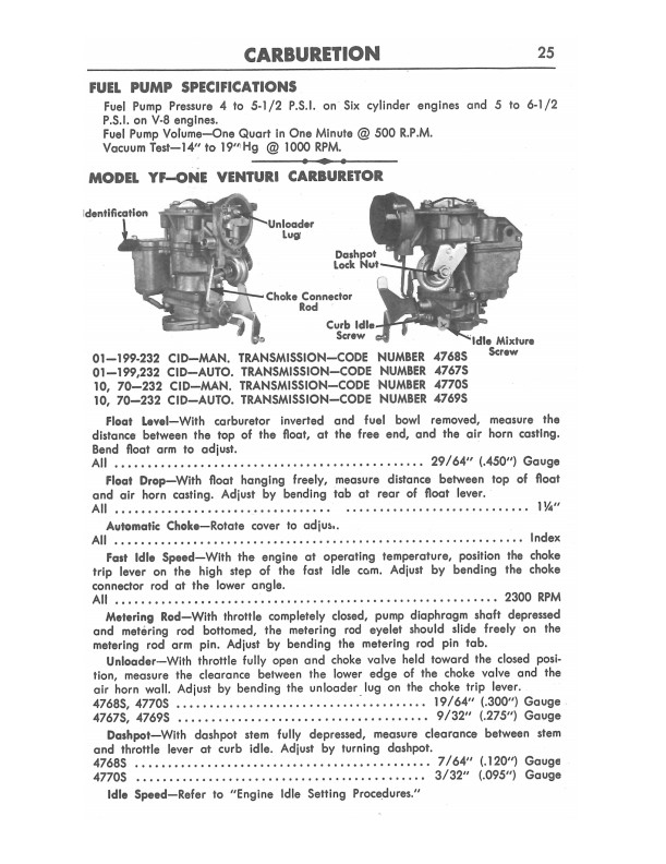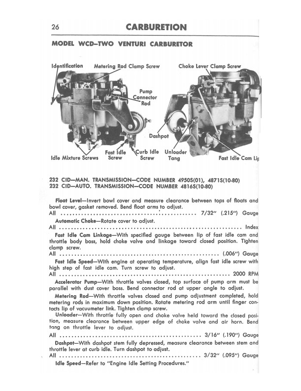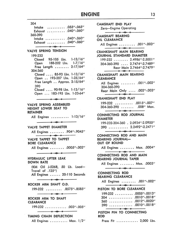 This handy little book is a reprint of a mechanic's accessory. You will find specifications for tune-up, engines, cooling systems, batteries, charging, ignition, carburetion, clutch, transmission, axles, brakes, wheel alignment, steering, suspension, bulb chart, as well as interior and exterior dimensions. Includes lubrication instructions and capacities. Buy now to own this AMC manual.