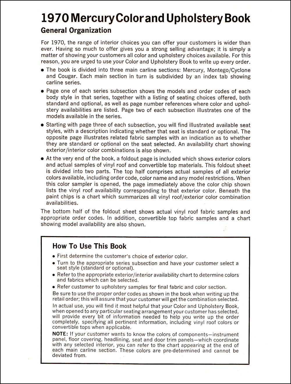 Color and upholstery -- examples of the paint and upholstery. Each dealership usually had only one or two copies of this valuable book, so these albums are much rarer than most other types of literature. However, they are often the only source for hard-to-find upholstery swatches - these are actual fabric samples and not printed images. You also get samples of vinyl roof and convertible top materials and actual paint chips.