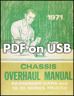 This USB offers page-for-page reproductions of two bound manuals that Chevrolet mechanics used to service trucks. It includes the 497 page "Chevrolet Truck Chassis Service Manual," and the 453 page "1971 Chassis Overhaul Manual."