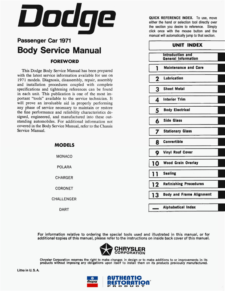 "1971 Dodge Chassis Service Manual" and "1971 Dodge Body Service Manual"