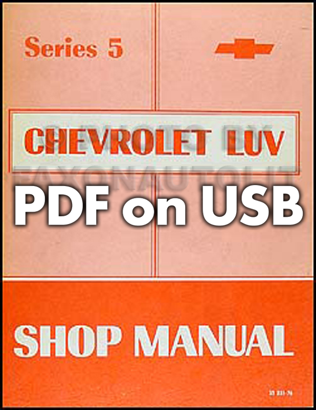 This USB offers page-for-page reproductions of six bound manuals that Chevrolet mechanics used to service pickups. It includes the 299 page "1972 Chevrolet-Luv Shop Manual", the 297 page "Series 2 Chevrolet-Luv Shop Manual", the 296 page "Series 3 Chevrolet-Luv Shop Manual", the 342 page "Series 4 Chevrolet-Luv Shop Manual", the 384 page "Series 5 Chevrolet-Luv Shop Manual" and the 387 page "Series 6 Chevrolet-Luv Shop Manual". In the service manuals you will find detailed service procedures for lubrication, frame, shock absorbers, front suspension, rear axle and suspension, brakes, engine, transmission, fuel, exhaust, wheels, tires, chassis-sheet metal, electrical system, heater and air-conditioning. With the step-by-step illustrated instructions, specifications, and wiring diagrams on this USB , you will have the information you need to keep your project on the road. You can use the information on this USB to restore all 1972-1977 Chevrolet-Luv Series 1 through 6 models. Buy now to own the best manuals for your vehicle on USB . We have manuals on paper also -- see our other items.