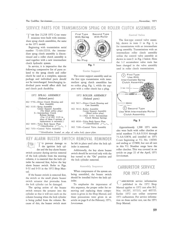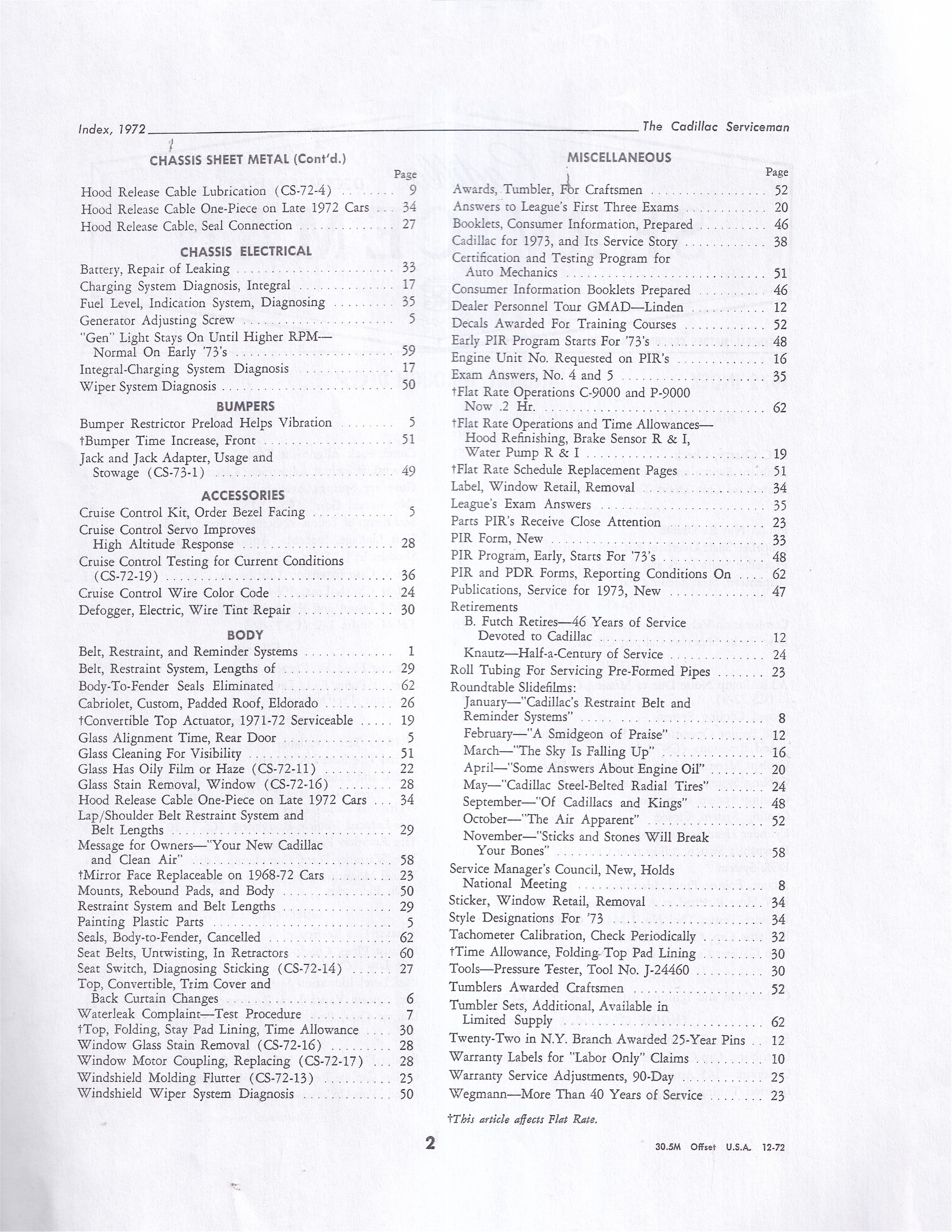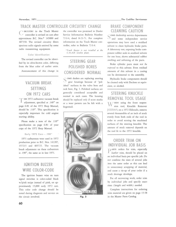 - mid-year parts changes: brake combination valve, generator rectifier bridge, high beam indicator light, transmission sprag, roller clutch, carburetor, Track Master controller, ignition buzzer wire color, Guide-Matic amplifier, window stabilizer pin and support, radial tires, fuel system vapor lock, a/c evaporator case drain tube, Teflon transmission seal rings, coolant metering holes in engine block, hood release cable, and Eldorado convertible back curtain