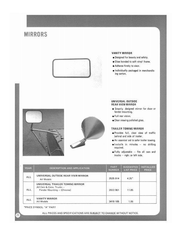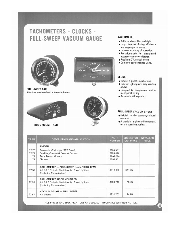 This is a quality reprint of the illustrated accessory catalog that was used in the parts department. You will find black and white illustrations and descriptions with part numbers and prices for each accessory. You'll see dozens of accessories like a/c, radios, bumper guards, clock, floor mats, lights, luggage racks, mirrors, power accessories, locks, shoulder belts, gauges, hubcaps, and much, much more. You'll also see a section on Mopar appearance and maintenance materials. Use this book to identify parts on your vehicle that are factory accessories, and to help you distinguish between genuine MoPar accessories and aftermarket add-ons. Find out what accessories you can add and still be authentic. New condition. Buy now to find out how to make your MoPar into a "loaded" model.
