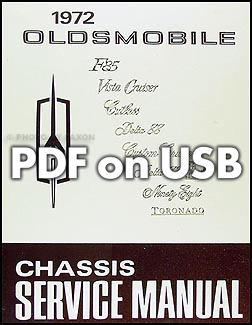 This USB offers page-for-page reproductions of two bound manuals that Olds mechanics used to service cars. It includes the: 1361 page "1972 Oldsmobile Chassis Service Manual," and the 717 page "Body by Fisher 1972 Service Manual." You will find detailed service procedures for maintenance, heater, air-conditioning, frame, body mountings, front suspension, rear suspension, propeller shaft, differential, brakes, engine, transmission, clutch, fuel tank, exhaust, steering, wheels, tires, chassis sheet metal, chassis electrical, instrument panel, wipers, radiator, grille, and bumpers. In the Fisher body manual, you will find detailed service procedures for lubrication, front end, head lining, roof, folding top, doors, rear quarter, rear end, seats, electrical, and exterior moldings. With the step-by-step illustrated instructions, specifications, and wiring diagrams on this USB, you will have the information you need to get your project on the road and keep it there. The best part is that you can print out the pages you need, dirty them in the shop, and then throw them away. Great if you have a hard copy that you want to keep clean. Buy now to own the best manuals for your car on USB. We have manuals on paper also -- see our other items.