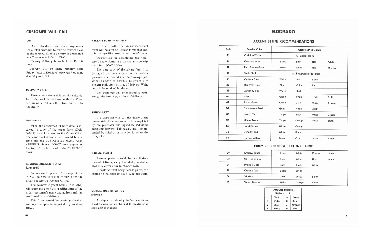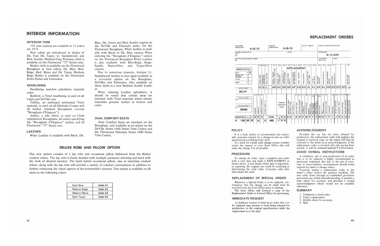 See lists of color choices for the exterior, vinyl roof, convertible top, accent stripes, cloth and leather upholstery, and color combinations (interior/exterior, exterior/roof, exterior/accent stripes) - these are lists only as the book is printed in black and white. Learn about interior features for each model. You'll see descriptions of equipment groups and also individual options, along with ordering codes. You will also find descriptions of options such as the lap robe, radios, lighted vanity, theft deterrent system,generators, gear ratios, tinted glass, whitewall tires, trailering package, and defogger. The end of the book includes ordering instructions for special order features, like non-standard colors, two tones, white leather interior combinations, all cloth seats, and landau roof.