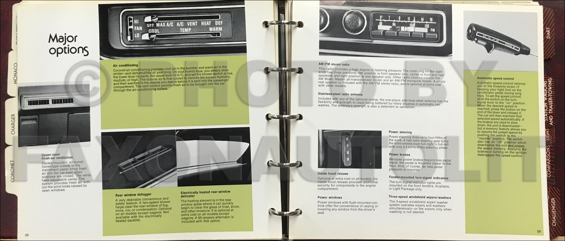 Data or Facts -- the most detailed information on standard and optional equipment, specifications, dimensions, accessories, and trim packages. You will find out the dealer's "inside information" that is far more detailed than a sales brochure. You'll find detailed descriptions of interior and exterior styling as well as mechanical and safety features with explanations of how the car changed for 1974. See pictures and descriptions of accessories. Buy now to be one of the few collectors to own this privileged information straight from the showroom floor.