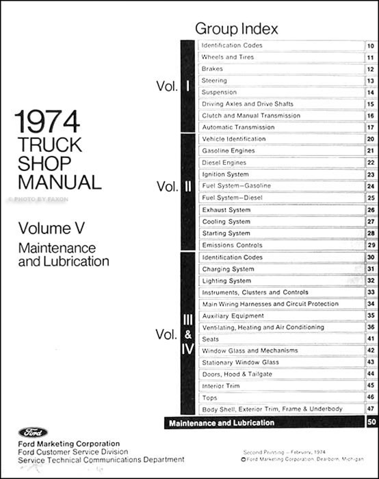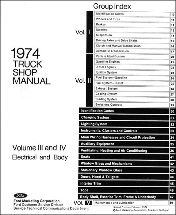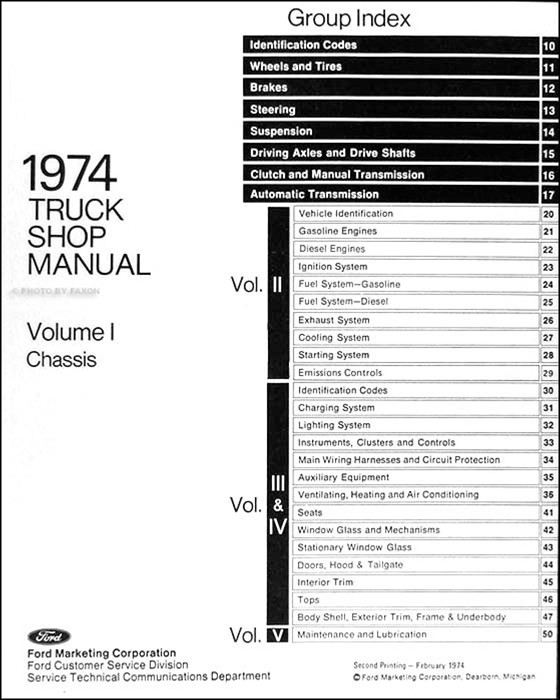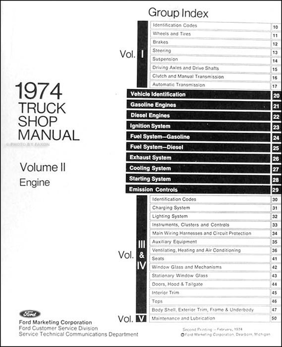 - the 861 page "Ford 1974 Truck Shop Manual Volume 1 Chassis." In volume 1 you will find detailed service procedures for identification codes, wheels, tires, brakes, steering, suspension, driving axles, drive shafts, clutch, manual transmissions, and automatic transmission.
