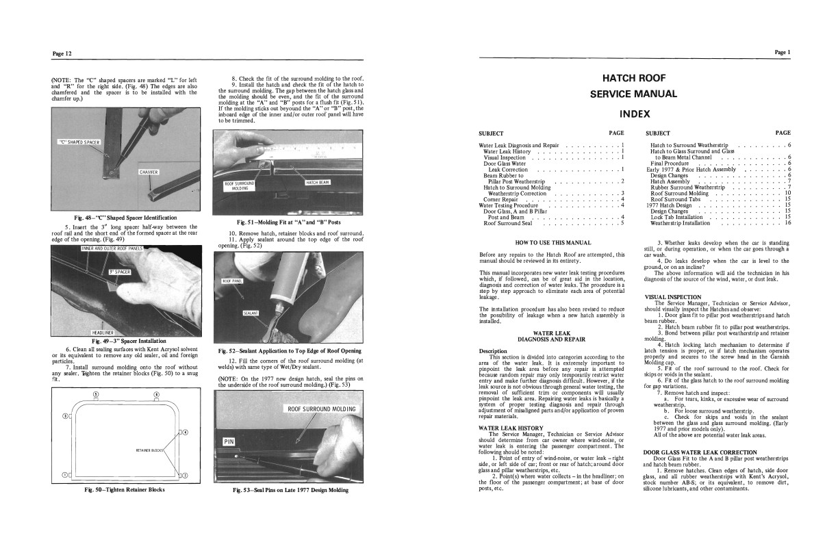This is a reprint factory-published manual that Oldsmobile dealership mechanics used to work on your car's T-top. In this manual you will find information for diagnosis and repair of water leaks, water testing procedure, hatch assembly, removal and installation of rubber surround weatherstrip and roof molding, and hatch design. Step-by-step instructions and lots of clear black and white pictures will help you keep your roof in good working order. You will also find an illustrated exploded view of the Hatch Roof disassembled and a list of part numbers in the front of the book. This supplement ONLY covers the hatch roof for the 1977 Oldsmobile car. For other repairs, this book will refer you to 1977 Oldsmobile repair manual. You will need both for complete repair. This book is in new condition. Buy now to own the best manual for your hatch roof.