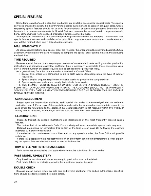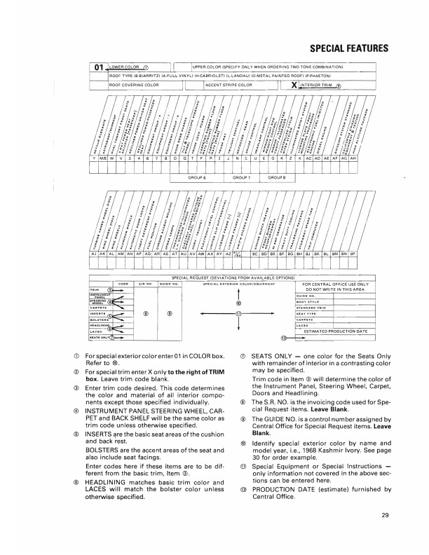 See lists of color choices for the exterior, vinyl roof, accent stripes, cloth and leather upholstery, and color combinations (interior/exterior, exterior/roof, exterior/accent stripes) - these are lists only as the book is printed in black and white. Learn about interior features for each model. You'll see descriptions of equipment groups and also individual options, along with ordering codes. You will also find descriptions of options such as the sun roof, astro roof, cabriolet vinyl roof, radios, power seats, opera lamps, fuel injection, controlled cycle wipers, fuel monitor, cruise control, illuminated entry, theft deterrent system, hubcaps,, trailering package, heavy duty cooling, and defogger. The end of the book includes ordering instructions for special order features, like non-standard colors, two tones, white leather interior combinations, all cloth seats, and landau roof.