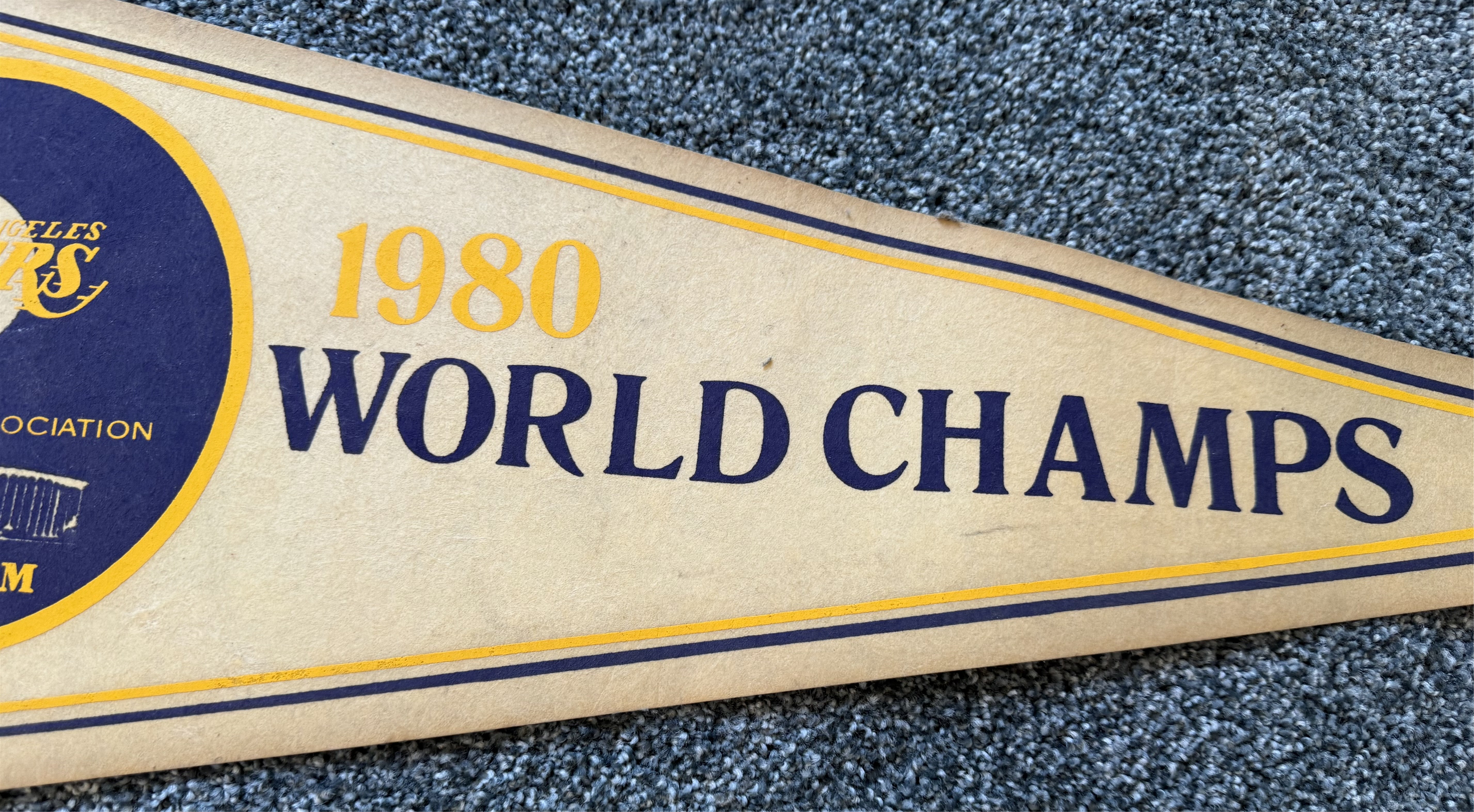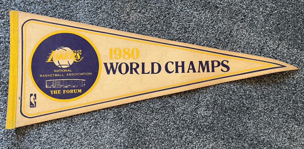 My father bought this original pennant back in 1980 when the Lakers won the championship. It is in the style of other pennants I have seen that just say Lakers, but I haven't been able to find another that says "1980 World Champs" on it like this.