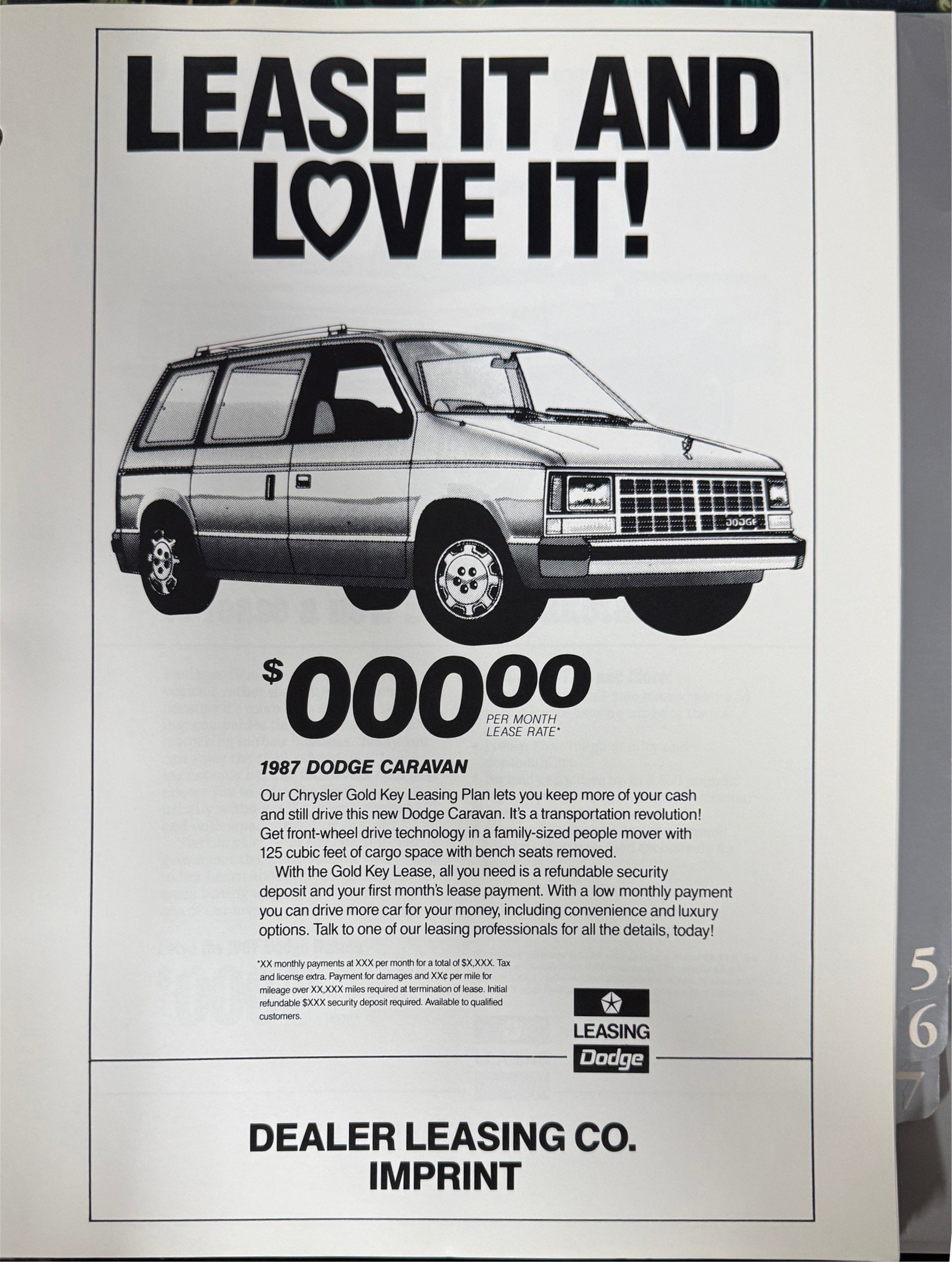Ad Planner -- Inside the book, you'll find ad slicks for newspaper ads, radio and television advertising information, billboard ad info, direct mail, and more. You'll see pages and pages of pictures of vehicles by themselves or with text for use in print ads. This includes explanations of Chrysler's marketing strategy, as well as raw materials for dealers to make their own local ads with pictures and text. Buy now to be one of the few collectors to own this privileged information.