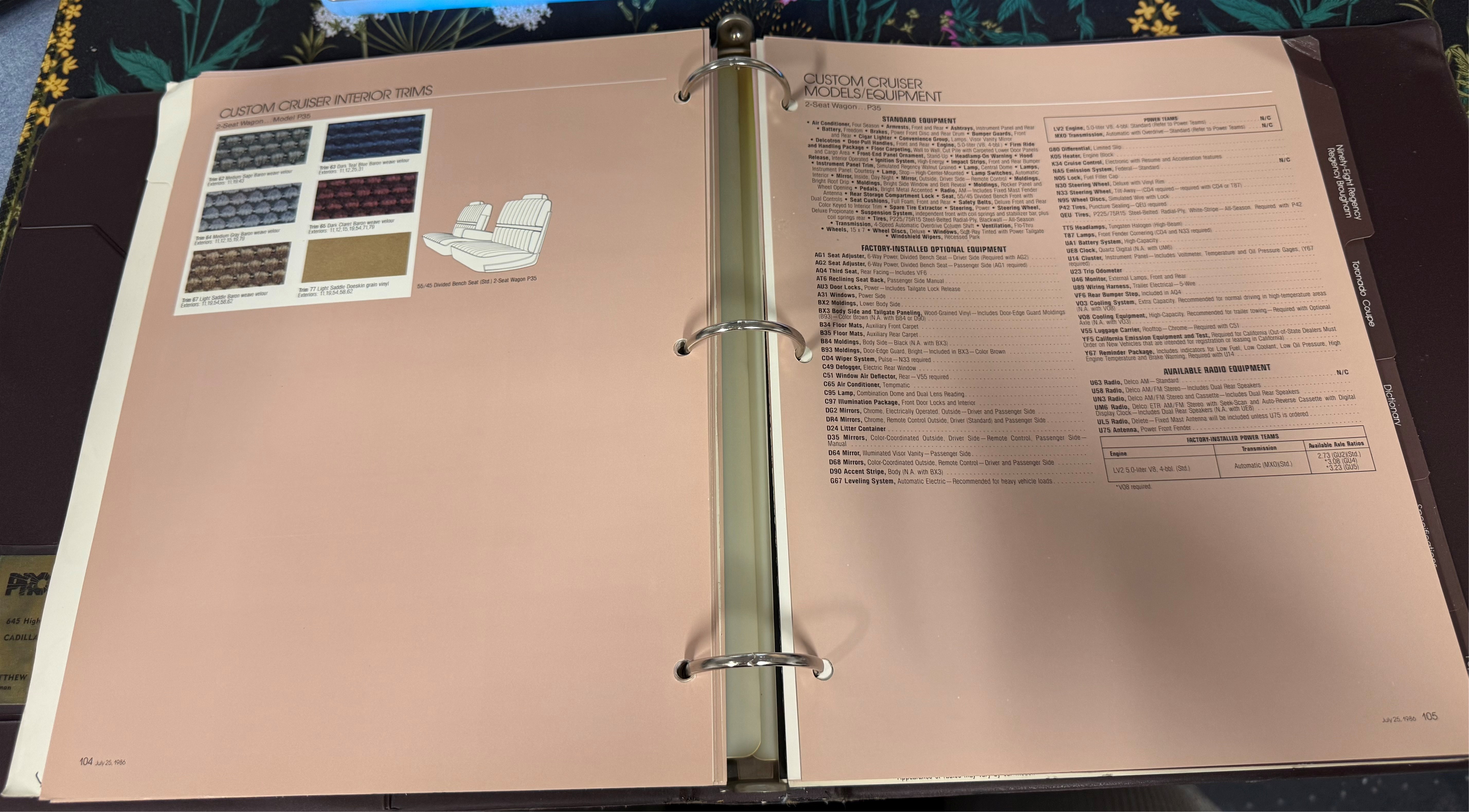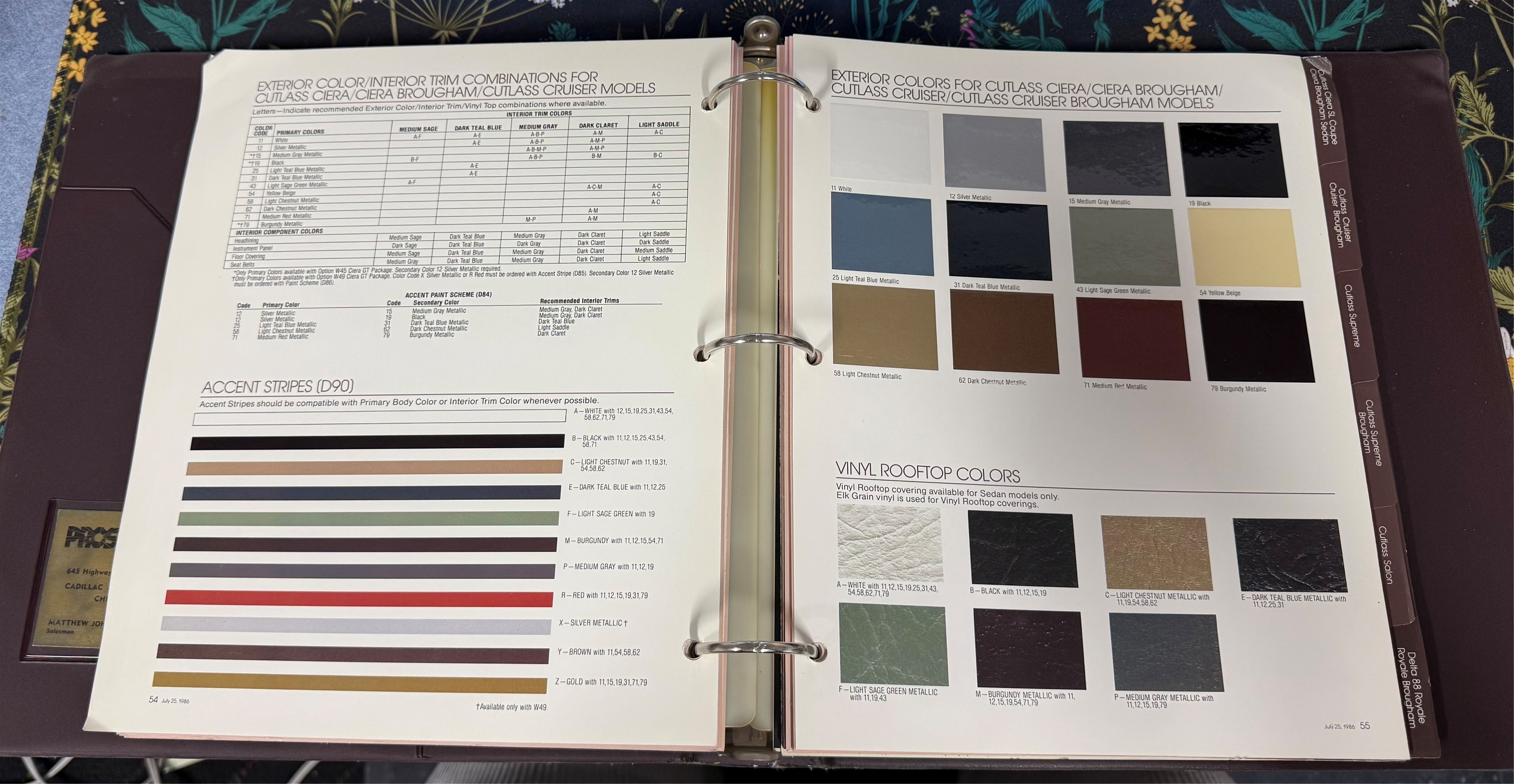 Color and upholstery -- examples of the paint and upholstery. Each dealership usually had only one or two copies of this valuable book, so these albums are much rarer than most other types of literature. However, they are often the only source for hard-to-find upholstery swatches - these are actual swatches. includes actual exterior paint chips, as well as detailed lists of interior/exterior color combinations, as well as printed images of accent striping colors and vinyl roof materials.