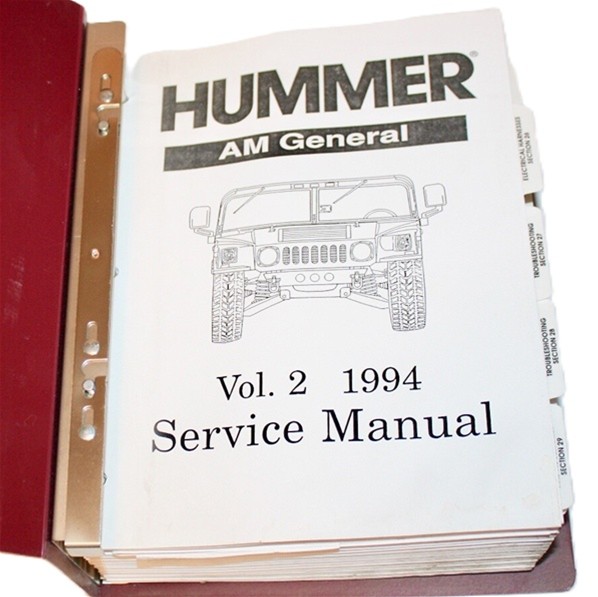 This is the original factory service manual set by AM General for 1994 Hummer vehicles. This is a 2 volume set in Hummer 3 ring binders. Volume 1 includes Maintenance information, engine repair, fuel, exhaust, and cooling system, transmission, transfer case and axles, brakes, wheels and tires, steering, suspension, frame, body, battery, alternator, and starter. Volume 2 includes electrical harnesses, mechanical and electrical diagnosis, optional equipment. Also included in volume 2 is the 1994 supplement, which has additional and updated information to all sections of the manual. Buy now to own the best manual for your Hummer.