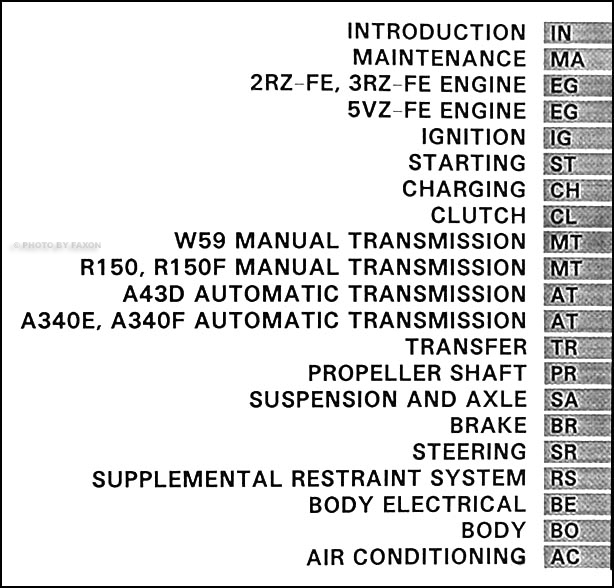 "1997 Toyota Tacoma Repair Manual" Written for Toyota dealership mechanics, this factory-published original manual shows you how to work on your vehicle. With step-by-step instructions, clear pictures, exploded view illustrations, schematics, and specifications, you will have the information you need to get your project on the road and keep it there. Covers all 1997 Toyota Tacoma models including SR5. This book measures 8.5" x 11" and is 2.5" thick. Buy now to own the best manual for your vehicle.
