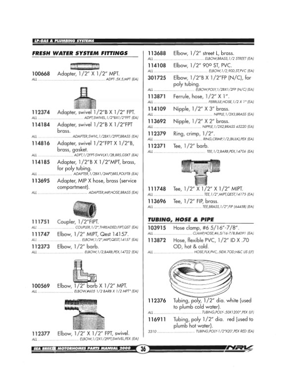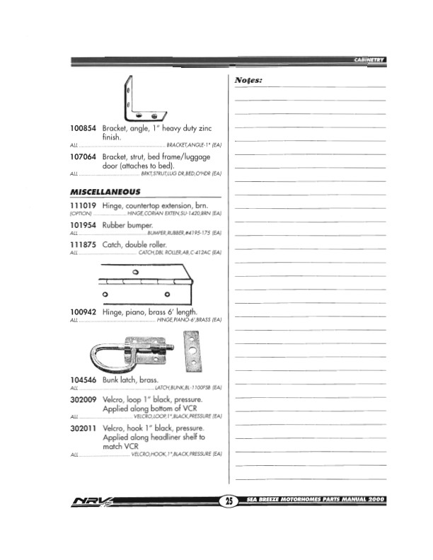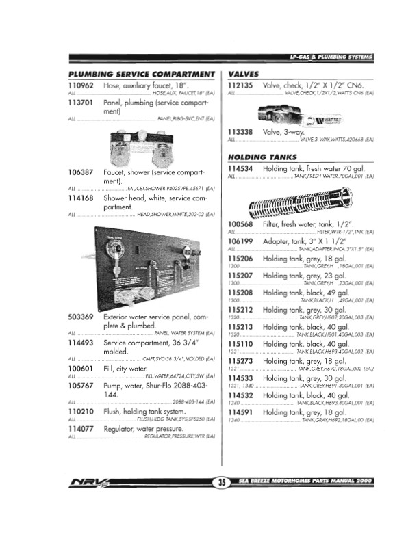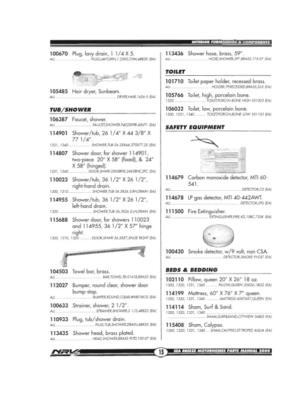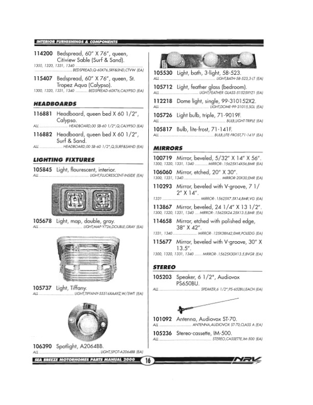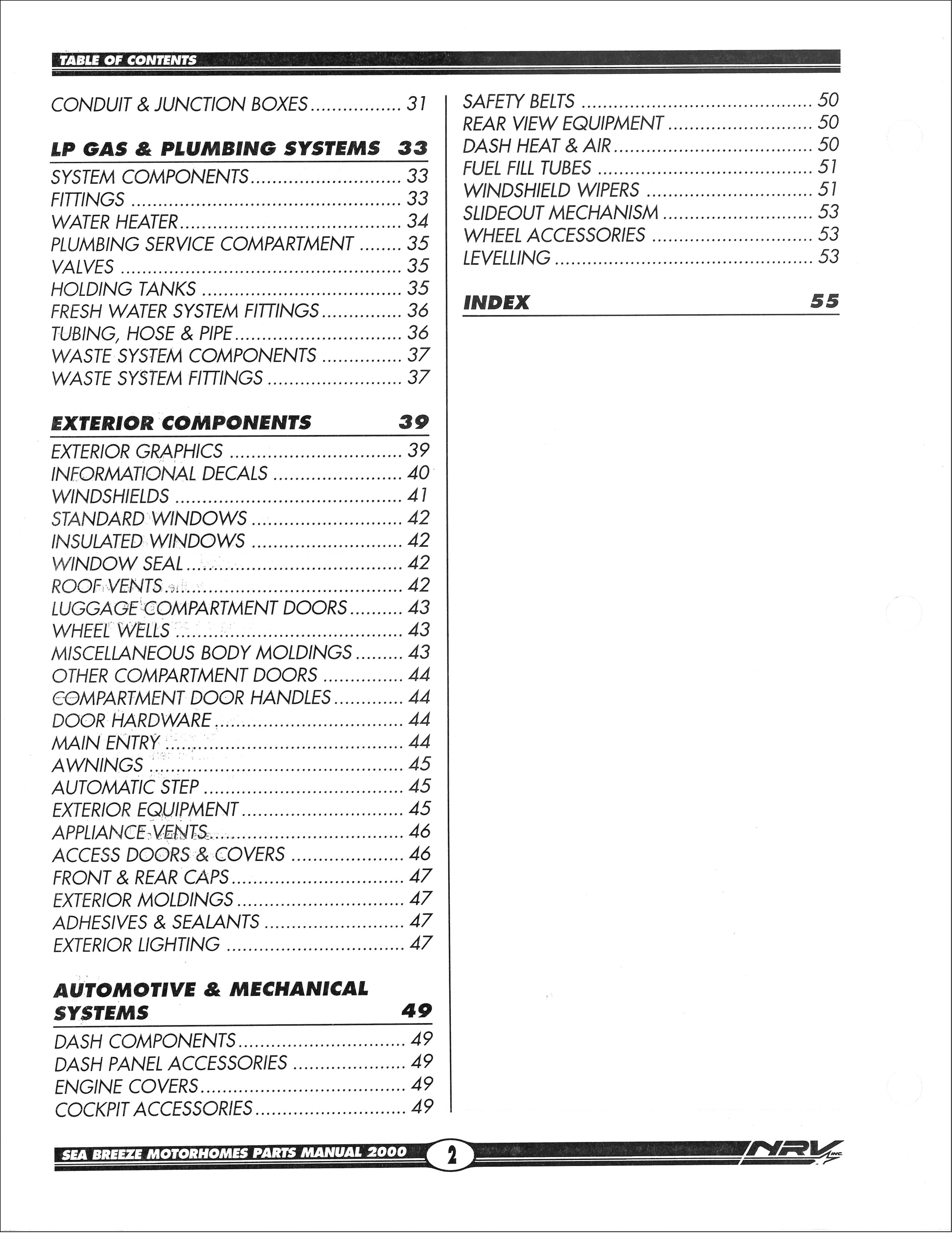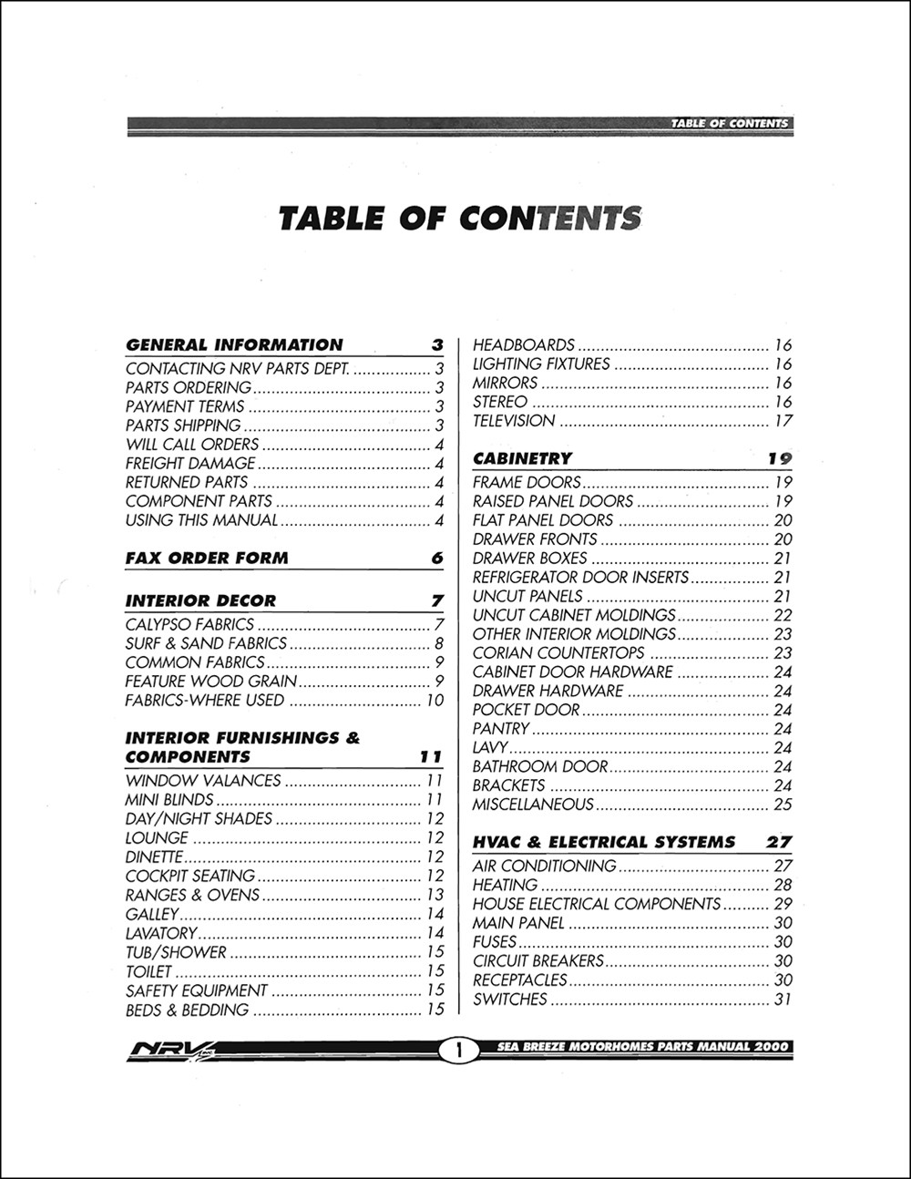 This is the book that dealership parts & service departments used to order parts for your RV. The illustrations in the book will help you to identify parts, and the exploded views can aid you with the assembly or disassembly of some parts of the vehicle. The text is a list of the parts available at the time of publication with data such as part numbers, model-year application and/or component application, part names, and more. You will see parts for interior fabrics, furnishings, cabinetry, HVAC, electrical systems, LP gas systems, plumbing, windows, awnings, exterior parts, slide mechanisms, landing gear, and chassis components.