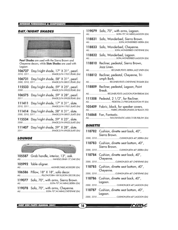 This is the book that dealership parts & service departments used to order parts. The illustrations in the book will help you to identify parts, and the exploded views can aid you with the assembly or disassembly of some parts of the vehicle. The text is a list of the parts available at the time of publication with data such as part numbers, model-year application and/or component application, part names, and more. It includes the insides of some appliances, such as the stove, but just a listing for the whole appliance for others, such as the refrigerator. You will find interior fabrics and furnishings, walls and cabinetry, hvac, electrical, LP gas system, plumbing, exterior graphics, windows, doors, lighting, Ford or Workhorse dash, and more.