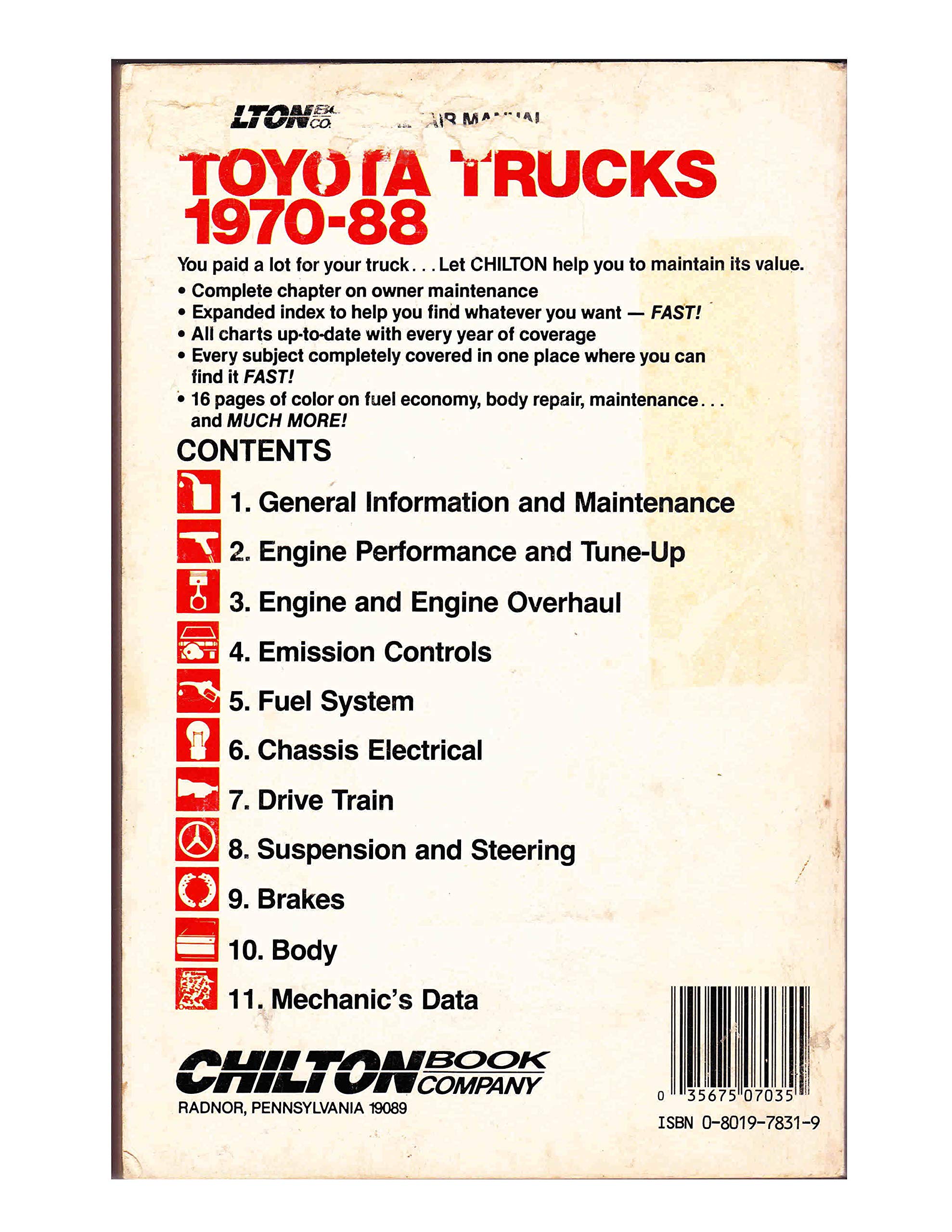 From Chilton's own description: Chilton's are written with the do-it-yourselfer in mind. Step-by-step instructions fill the gap between the owner's manual in the glove compartment and the factory service manual. Specifications, line drawings, and photographs pertaining to your vehicle make tune-ups, brake jobs, general maintenance and hundreds of other repairs routine. With today's high cost for automotive repair work, this guide is an important tool you can own.