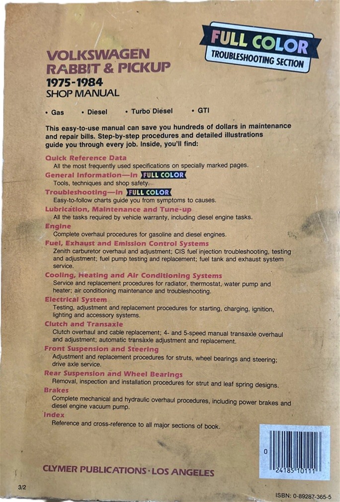VW Rabbit & pickup, 1975-1984 gas, diesel & turbo diesel shop manual