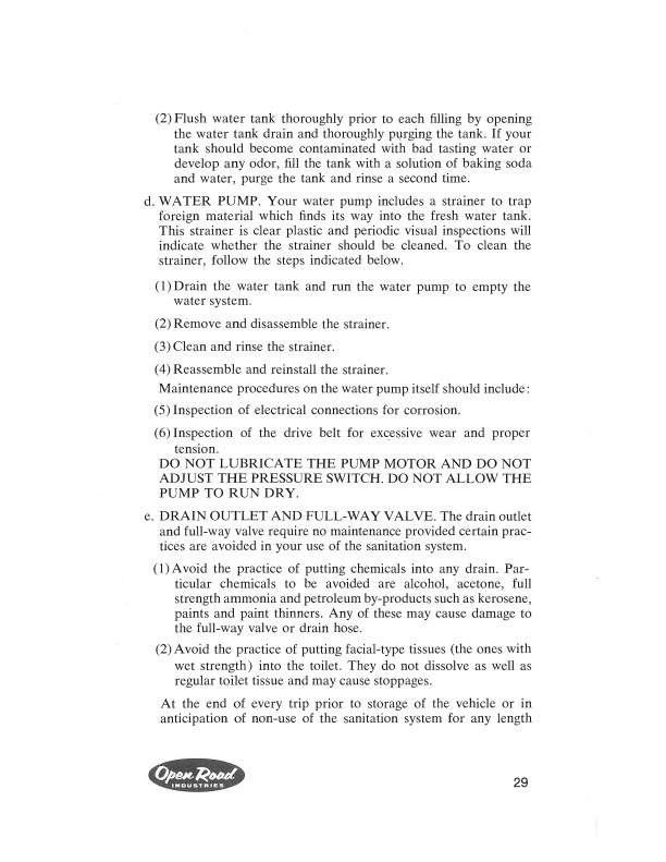 This manual was written by Open Road Industries for your Mini Motor Home. This manual begins with a section dedicated to getting you familiar with the exterior and interior features of your Mini Motor Home. Learn about operation of the water system, toilet/waste system, L.P.G. system and electrical system. There is a maintenance section that covers the basic systems, exterior of the Mini Motor Home, interior of the Mini Motor Home and cold weather maintenance. There's also sections for traveling tips and the open road camper club.