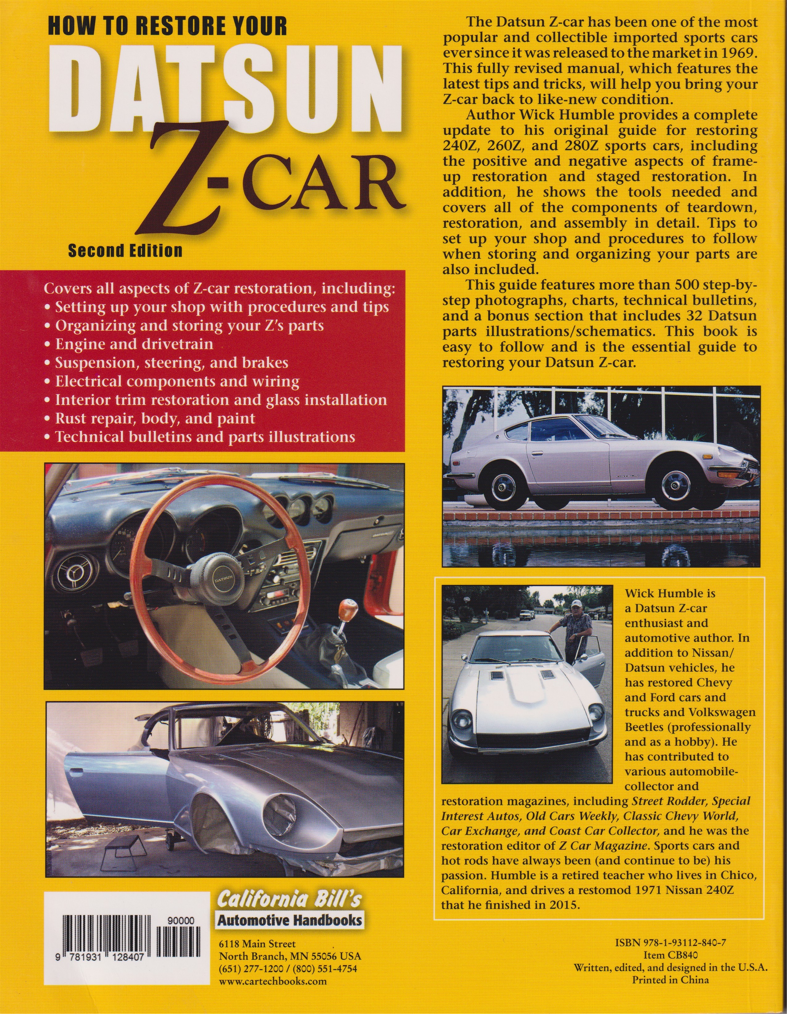 Wick Humble provides a complete update to his original guide for restoring 240Z, 260Z, and 280Z sports cars, including the pluses and minuses of frame-up or staged restoration. He also discusses the tools needed and covers in detail all components of teardown, restoration, and assembly. Includes tips on setting up your shop and what procedure to follow when storing and organizing your parts.
